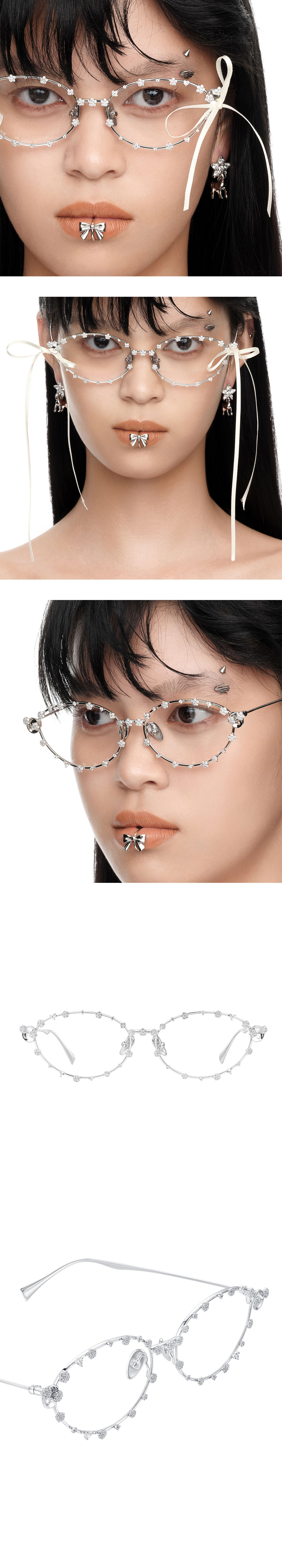 위민 플라워 젬스톤 데코레이션 글래스 실버입니다. - 18K 골드 도금과 지르콘이 조화로운 페이스 주얼리 - 정교한 플라워 세팅이 선사하는 로맨틱하고 화려한 실루엣 - 28g의 무게감과 프레임 곳곳의 지르콘 세팅이 선사하는 화려한 실루엣 - 가로 14.7cm의 볼륨감 있는 프레임으로 완성한 스테이트먼트 아이템