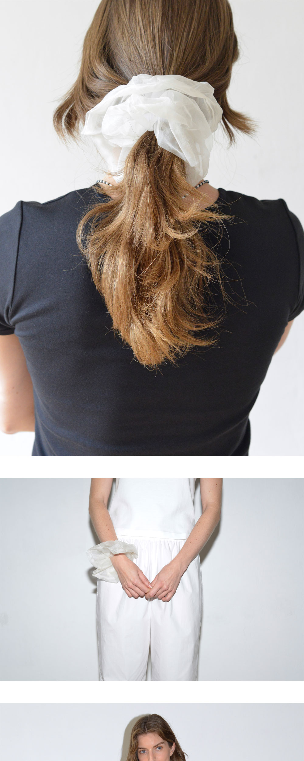 하이 오간자 스크런치 아이보리입니다. - 비치는 효과가 특징인 고품질 오간자 실크 소재 사용 - 은은하고 고급스러운 아이보리 컬러의 헤어 액세서리 - 헤어 슈슈는 물론 손목 액세서리로도 다양하게 연출 가능