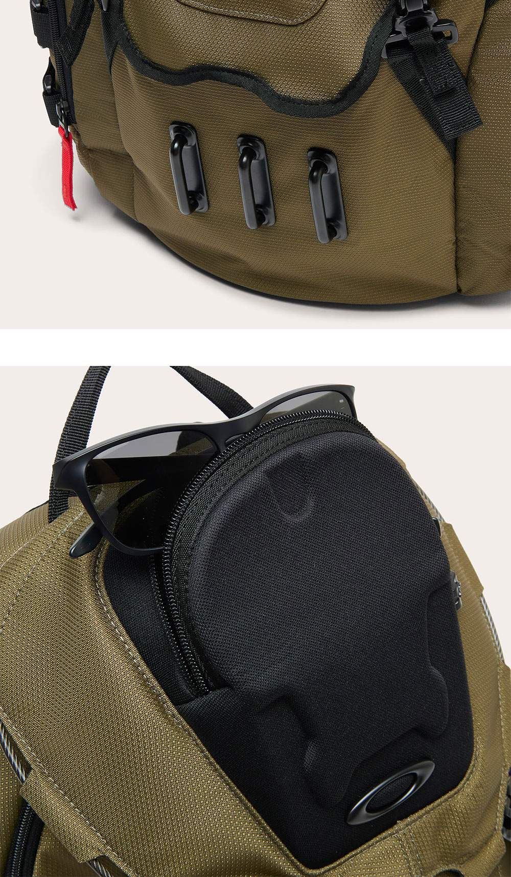오클리 배스룸 싱크 RC 백팩 아미 그린 입니다. - 내구성이 뛰어난 코듀라(Cordura) 및 발수 원단 사용 - 내부 패드 슬리브로 15인치 노트북 수납 가능 - 안경/선글라스 보호용 하드 케이스, 상단 미디어 포켓 등 다용도 포켓 - 조절 가능한 브러시드 안감의 패드 어깨끈 및 버클