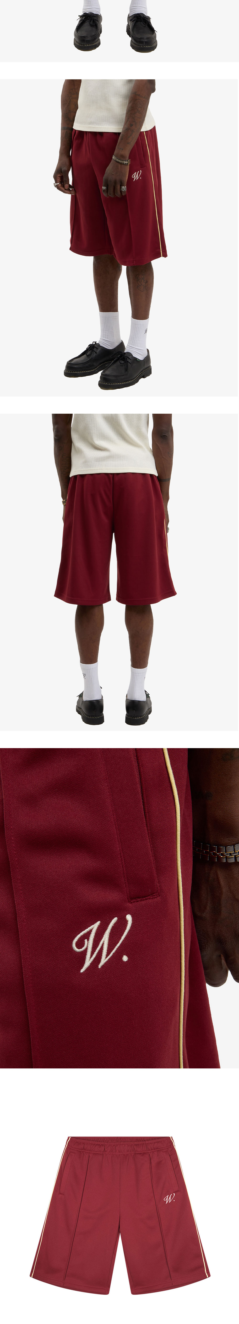 워크 인 파리 시그니처 버건디 조깅 쇼트 루주입니다. - 전면 'W.' 자수 로고와 측면 아이보리 배색 파이핑 - 활동성이 뛰어난 허리 밴딩과 넉넉한 조깅 쇼츠 핏 - 클래식한 무드의 깊이감 있는 컬러 *실제 색상은 상세 이미지보다 모델 착용 컷에 가깝습니다.