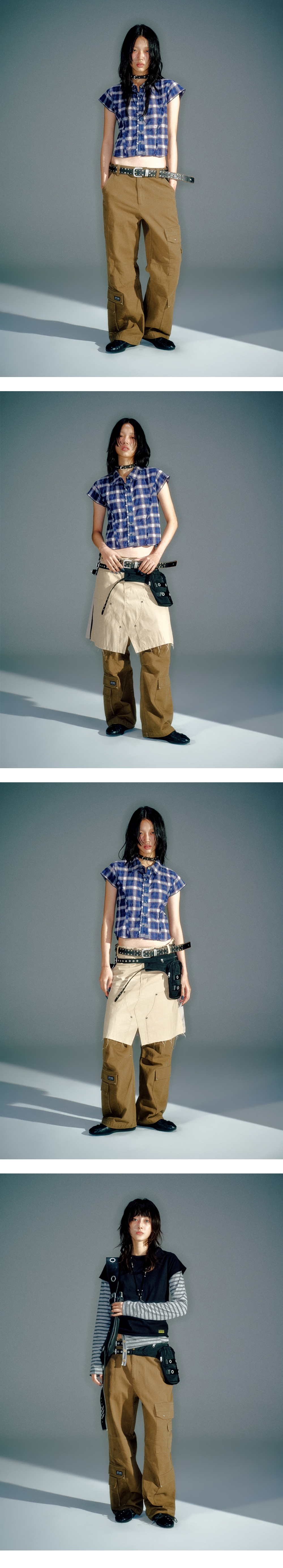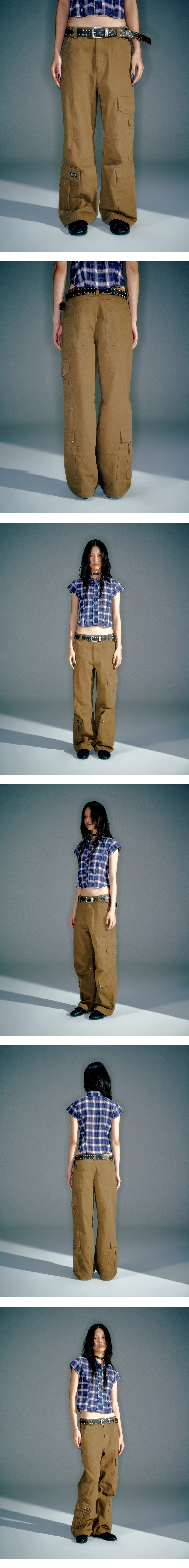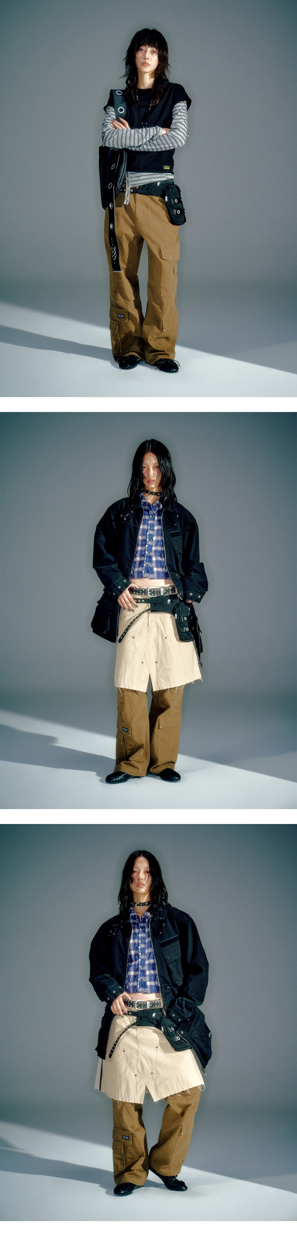 넉넉한 수납공간을 갖춘 밀리터리 무드의 변형 카고 팬츠 가먼트 워싱 가공으로 자연스러운 색감과 빈티지한 질감 표현 무릎 부분 턱 디테일을 더해 활동성을 높인 입체적인 실루엣 베이컨트 자체 제작 리벳 사용으로 브랜드 아이덴티티 강조 S / M (CM) Length : 101 / 102 Waist : 37 / 39 Hip : 52 / 54 Thigh : 33 / 34 Front Rise : 31 / 32 Hem : 25 / 26 1. Model is 174cm and is wearing a size S 2. Model is 168cm and is wearing a size S