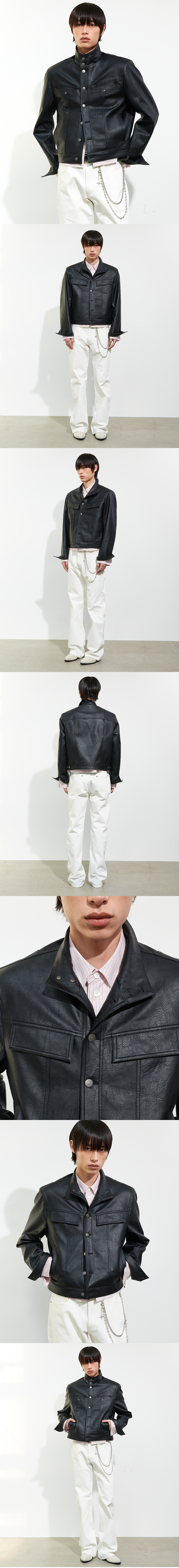페이크 레더 소재로 제작된 하이넥 트러커 재킷입니다. 하이넥 구조와 어깨 패드가 결합되어 상체 라인을 또렷하게 잡아주며, 컴팩트한 기장감으로 균형 잡힌 실루엣을 완성합니다. 뒷면 하단에는 사이즈 조절이 가능한 탭 디테일을 더해 착용자의 체형에 맞게 실루엣 조절이 가능합니다. -DETAIL- 하이넥 구조 어깨 패드 내장 프런트 버튼 여밈 가슴 플랩 포켓 뒷면 사이즈 조절 탭 디테일 MADE IN KOREA