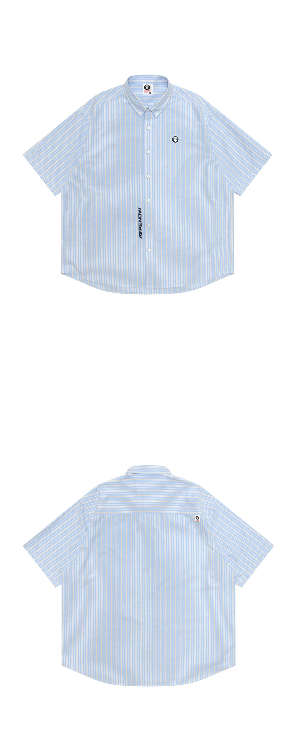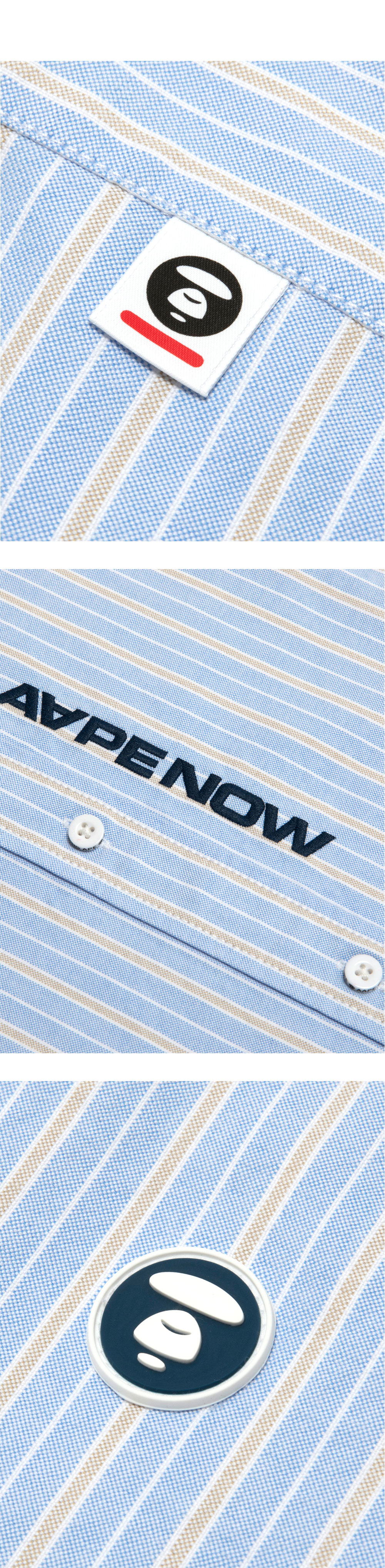 에이프 나우 숏 슬리브 셔츠 블루 입니다. - 블루 버티컬 스트라이프 패턴 - 가슴 부분 문페이스 로고 자수 - 전면 하단 AAPE NOW 레터링 프린트 - 클래식한 버튼다운 칼라 디자인