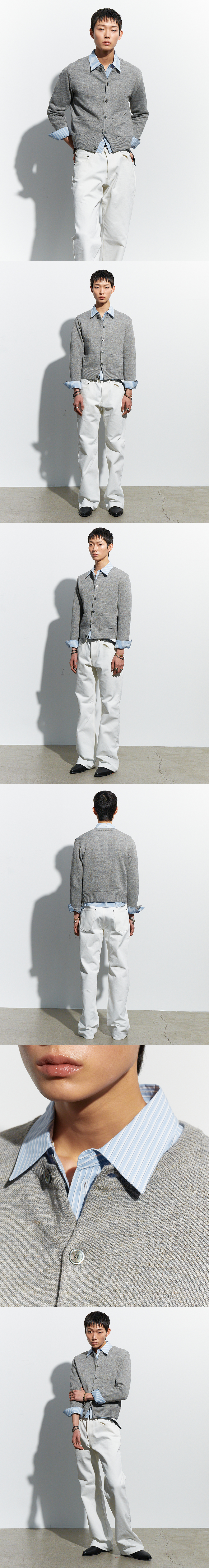 멜란지 텍스처의 울·리넨·코튼 혼방 원사로 제작된 라운드넥 가디건입니다. 래귤러한 바디 밸런스에 크롭한 기장을 더해 단정하면서도 경쾌한 실루엣을 형성합니다. 밀도감 있는 니트 조직이 형태를 안정적으로 유지하며, 소매단 버튼 디테일로 커프스처럼 연출할 수 있어 다양한 착용이 가능합니다. -DETAIL- 라운드넥 디자인 래귤러 & 크롭 실루엣 프런트 자개 버튼 여밈 소매단 자개 버튼 디테일 프론트 포켓 넥·밑단·소맷단 립 조직 마감 MADE IN KOREA