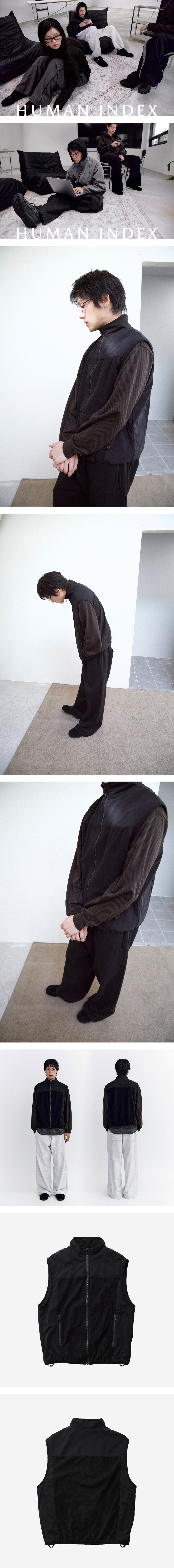 human thermal vest - 입체감을 살린 플리스 배색 디테일 - 내부 매쉬 구조로 쾌적한 착용감 - 실용성을 고려한 사이드 지퍼 포켓 - 적당한 높이의 넥라인으로 완성 - YKK 비슬론 지퍼 사양 - 실루엣 조절 가능한 밑단 스트링 적용 [위 사진부터 순서대로] *모델 1: 173cm / 마른 체형, 3사이즈 착용 *모델 2: 180cm / 마른 체형, 4사이즈 착용