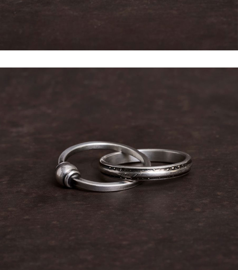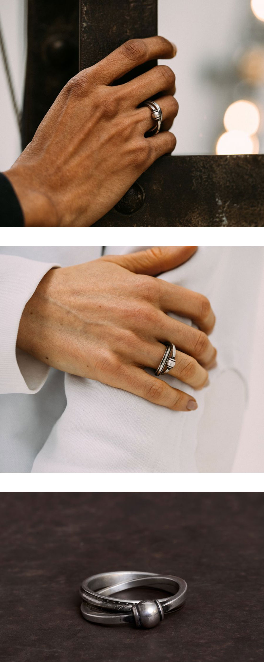 베르크슈타트 뮌헨 링 인 링 펄 실버 입니다. - 선형 양각 무늬가 새겨진 반지가 은색 진주가 박힌 두 번째 반지와 납땜되어 있음 - 진주를 시대를 초월하는 은색 버전으로 표현함