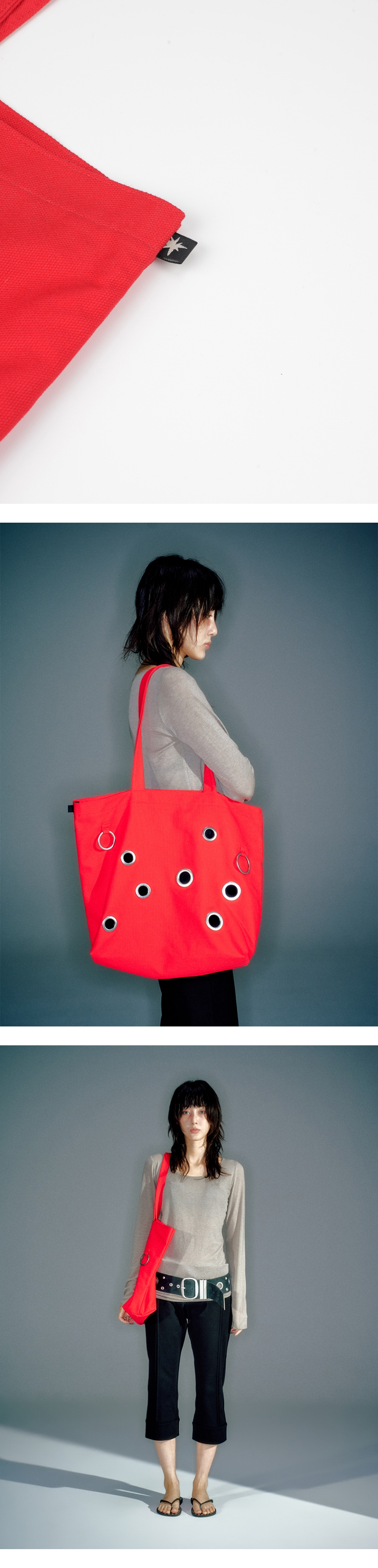 탄탄한 코튼 소재를 사용한 빅사이즈 에코백 빈티지한 컬러감의 두께 있는 O링과 아일렛을 믹스해 사용 워크웨어 무드의 라벨 디테일 적용 나일론 안감을 사용한 배색 디테일로 완성도 강화 가로50cm X 세로 43.5cm SHELL 1 : COTTON 100% SHELL 2 : NYLON 100%