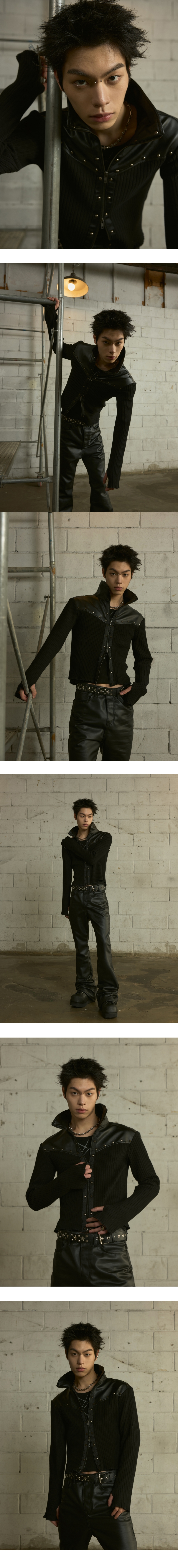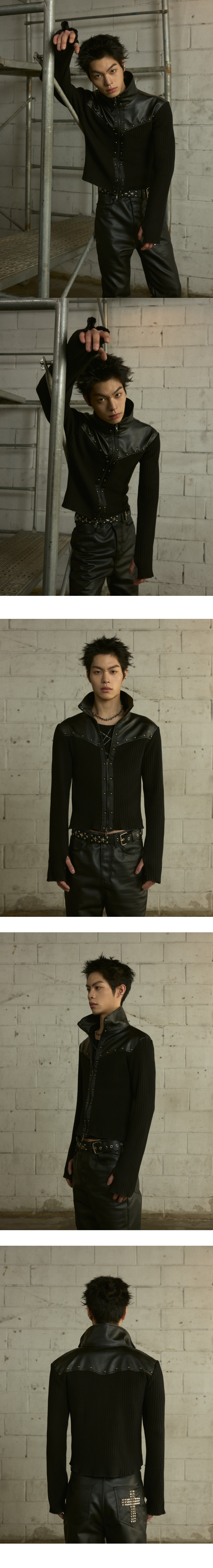 랜 아카이브 0121 레더 패널 스터드 집업 - 블랙