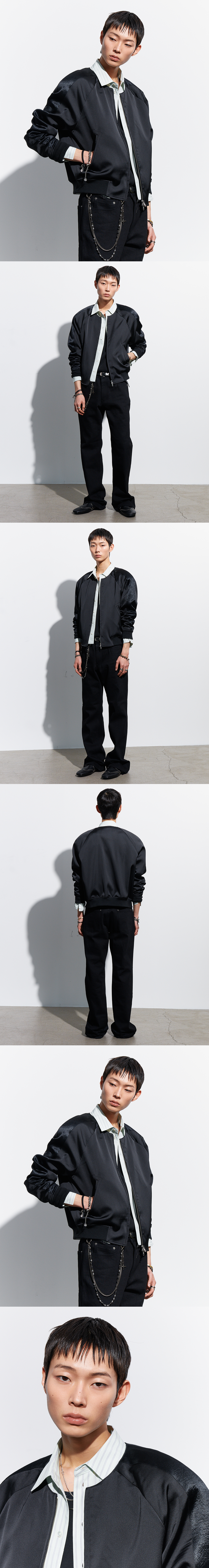 은은한 광택이 감도는 몸판과 결이 다른 패널을 조합해 제작한 수베니어 자켓입니다. 칼라를 배제한 구조로 넥 라인을 간결하게 정리해 전체 실루엣을 더욱 미니멀하게 완성했습니다. 서로 다른 표면감이 자연스럽게 대비를 이루며 절제된 포인트를 더합니다. 래글런 숄더 내장 패드 삽입으로 어깨를 보강하여 균형 있는 비율을 완성합니다. 가볍게 걸쳐도 형태가 무너지지 않는 균형 잡힌 실루엣이 특징입니다. -DETAIL- 몸판과 패널 소재 대비 구성 칼라리스 디자인 어깨 패드 내장 프런트 지퍼 여밈 사이드 웰트 포켓 립 조직 밑단 및 소맷단 MADE IN KOREA