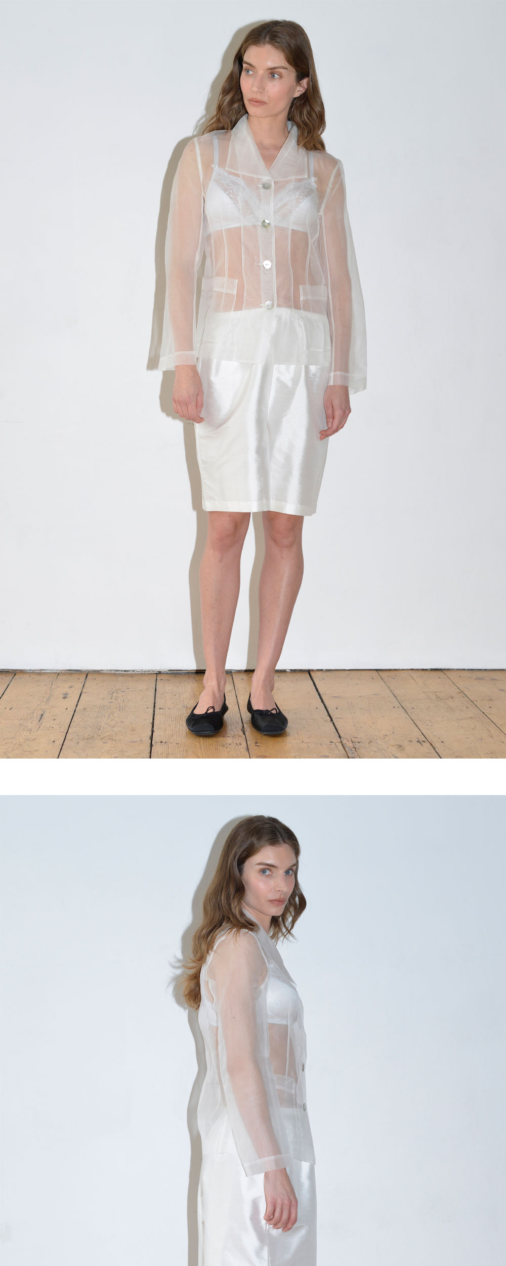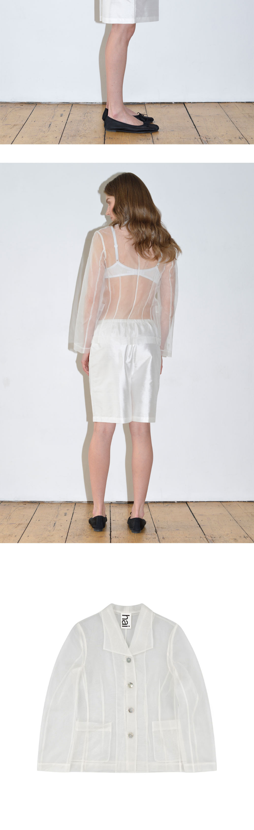 하이 우먼 라나 자켓 아이보리 입니다. - 속이 비치는 투명한 실크 소재 - 여름용 아우터 및 레이어드 활용 - 전면 버튼 여밈과 패치 포켓 디테일