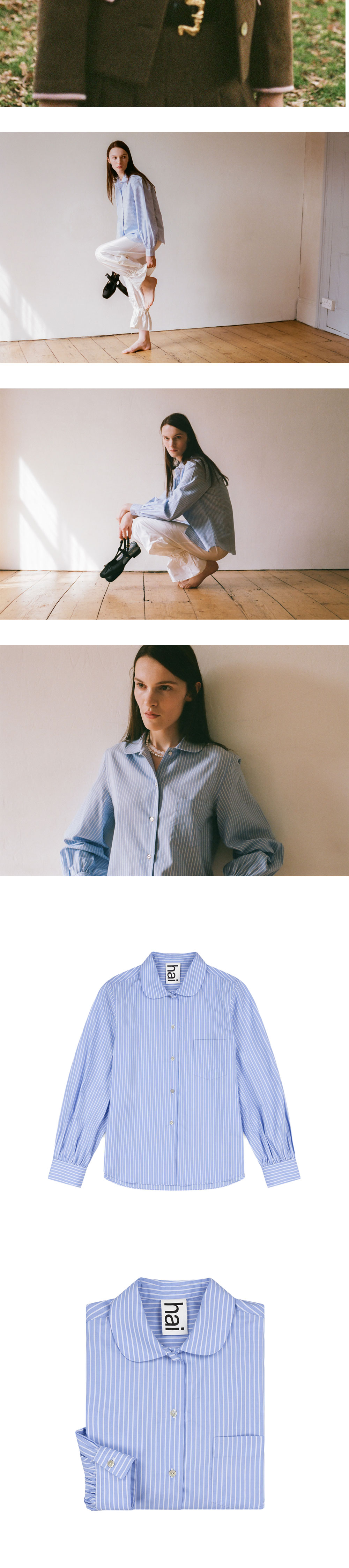 하이 우먼 캐롤 블라우스 블루 앤 화이트 스트라이프 입니다. - 블루 & 화이트 세로 스트라이프 패턴 - 둥근 피터팬 칼라와 패치 포켓 포인트 - 볼륨 있는 소매와 편안한 루즈핏