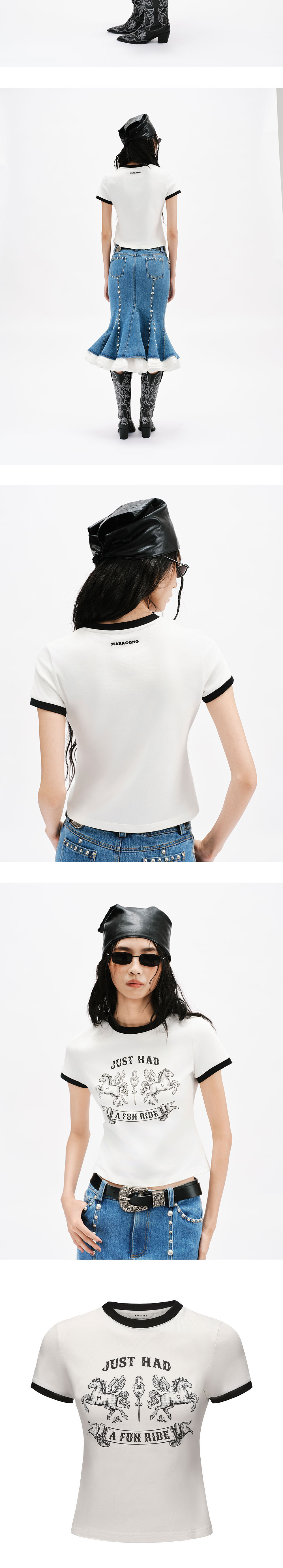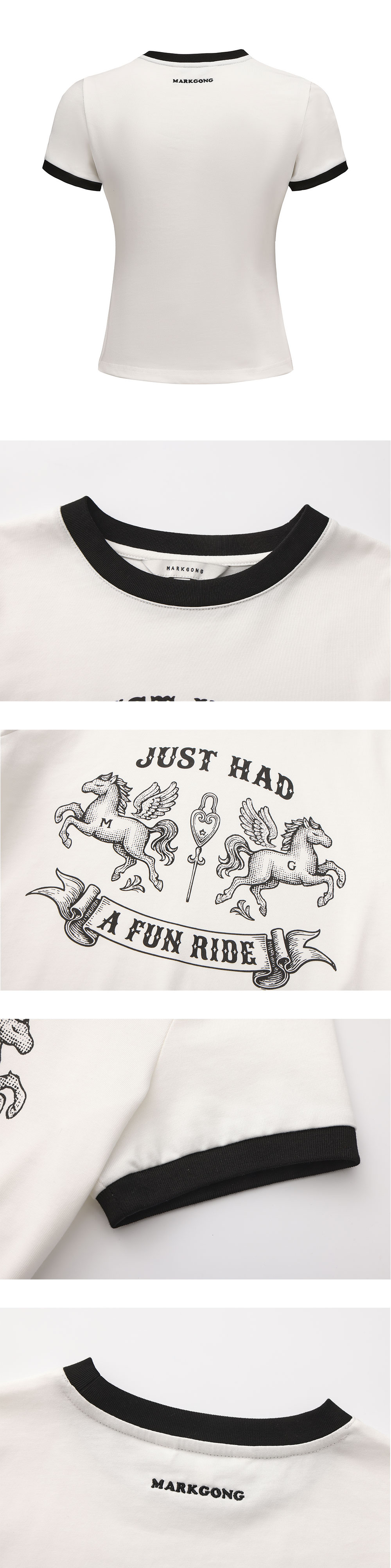 마크공 우먼 펀 라이드 프린티드 티셔츠 화이트 입니다. - 전면 두 마리의 말과 "JUST HAD A FUN RIDE" 레터링 그래픽 - 네크라인과 소매 끝단의 블랙 배색 포인트 - 슬림한 크롭 핏