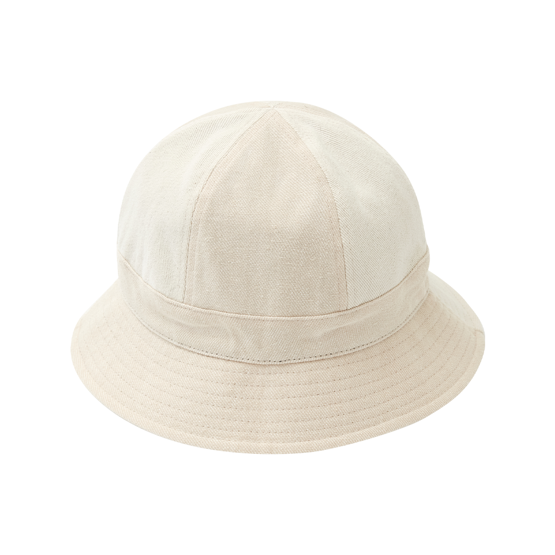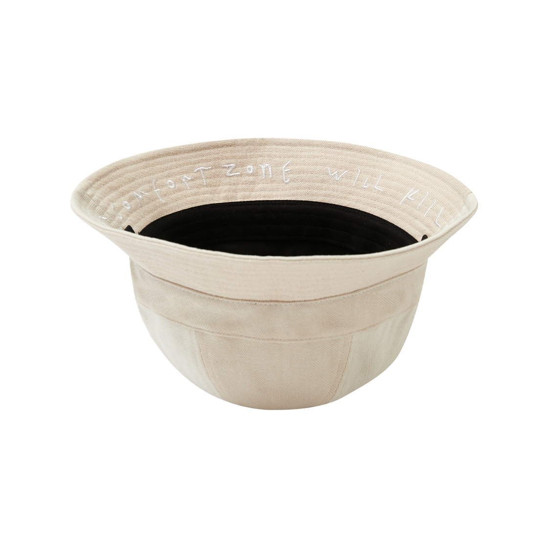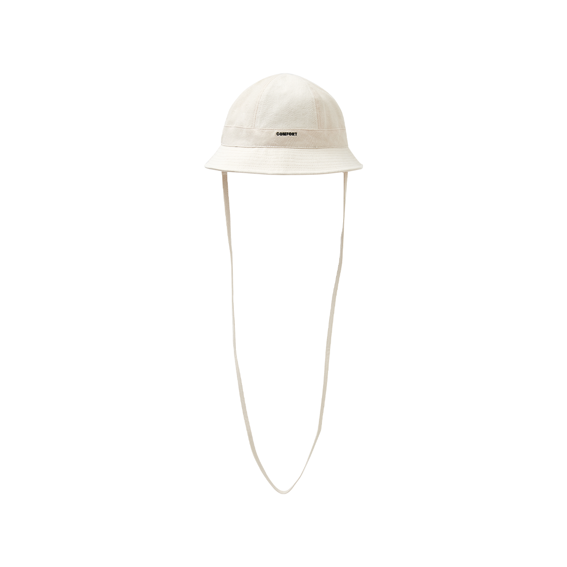 콤포트 로고를 자수로 새긴 버킷 햇. 같은 톤의 두 가지 원단을 패치워크했으며, 긴 스트링이 포함되어 어깨에 가방처럼 메거나 들 수 있습니다.