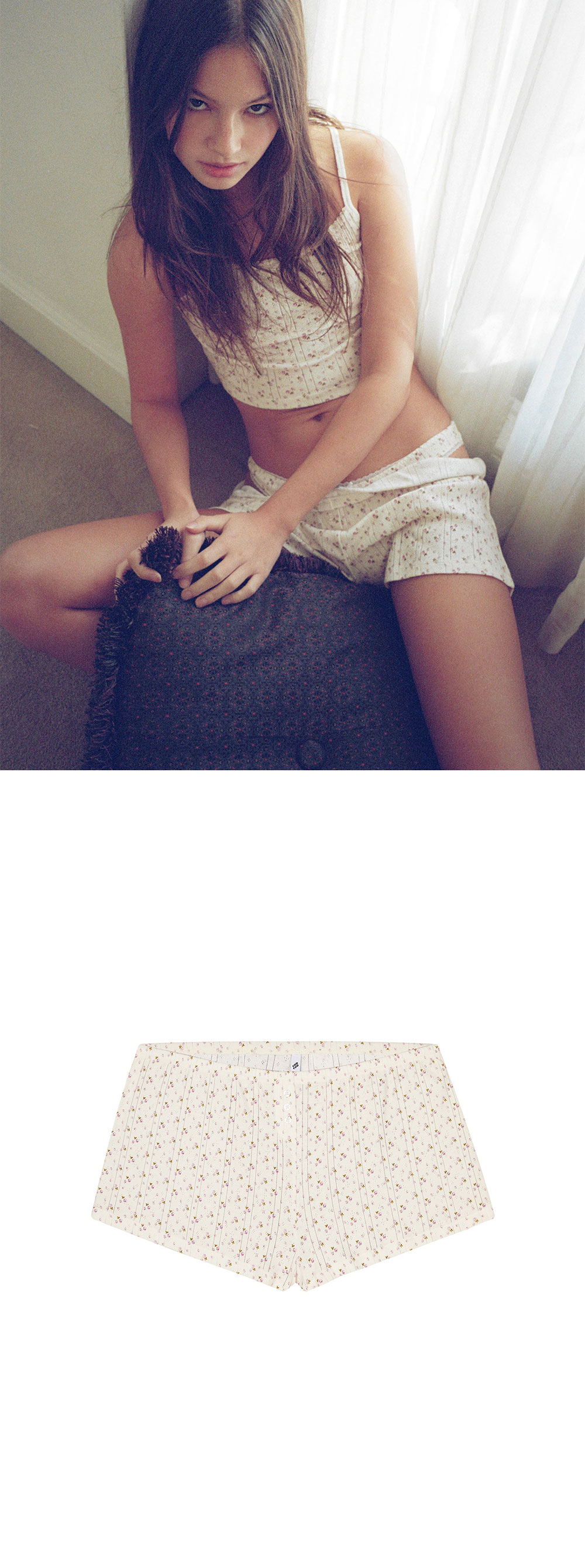 쿠쿠 인티메이트 우먼 더 쇼트 잉글리시 로즈 입니다. - 잔잔한 잉글리시 로즈 플로럴 패턴 디자인 - 전면 중앙 3개의 미니 버튼 장식 포인트 - 편안한 엘라스틱 웨이스트 밴드 - 가볍고 부드러운 포인텔 니트 조직