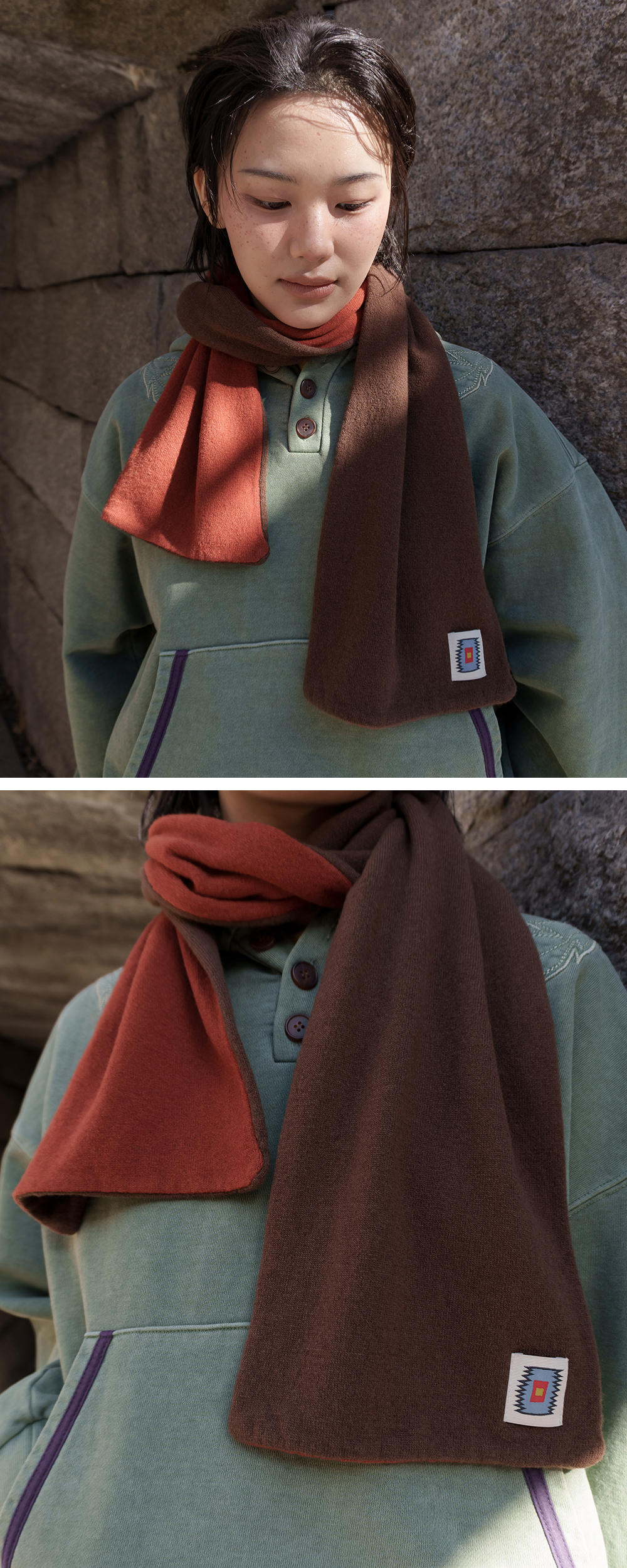 Product Info. - 울 캐시미어 블렌딩 원사로 편직한 소프트 텍스처의 스카프 - 가벼운 두께감으로 간절기 착용에 적합한 아이템 - 감각적인 컬러 블럭 구성 - 시그니처 직조 라벨 포인트