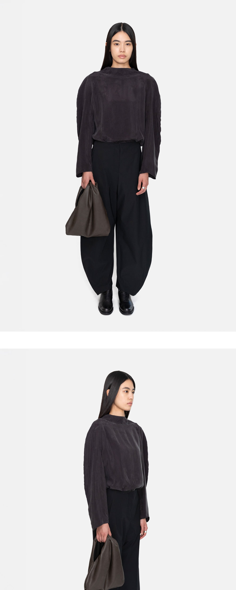 아모멘토 우먼 커브드 실루엣 팬츠 블랙입니다. - 루즈하게 쌓이는 긴 기장감으로 트렌디한 핏 연출 - 탄탄한 소재로 구조적인 실루엣 표현 - 불필요한 디테일을 배제해 실루엣을 강조 - 단독으로도, 베이직한 아이템과도 감각적인 스타일링 가능 *모델 스펙: 177cm 0 Size 착용