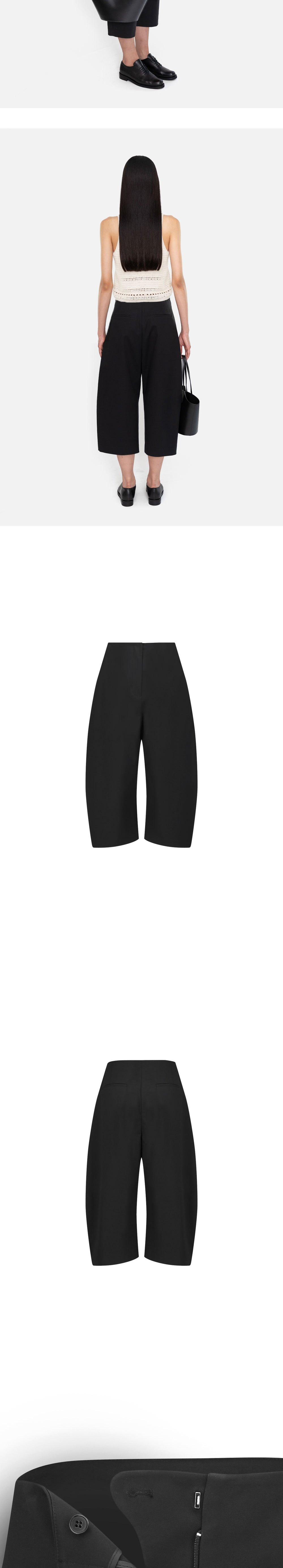 아모멘토 우먼 커브드 카프리 팬츠 블랙입니다. - 코튼 혼방 소재로 편안한 착용감과 실루엣 강조 - 크롭한 기장감으로 트렌디한 실루엣 - 불필요한 디테일을 배제한 완성도 높은 디자인 - 블라인드 스티치, 속단추 여밈으로 미니멀한 디테일 *모델 스펙: 177cm 0 Size 착용