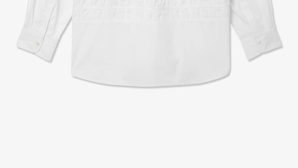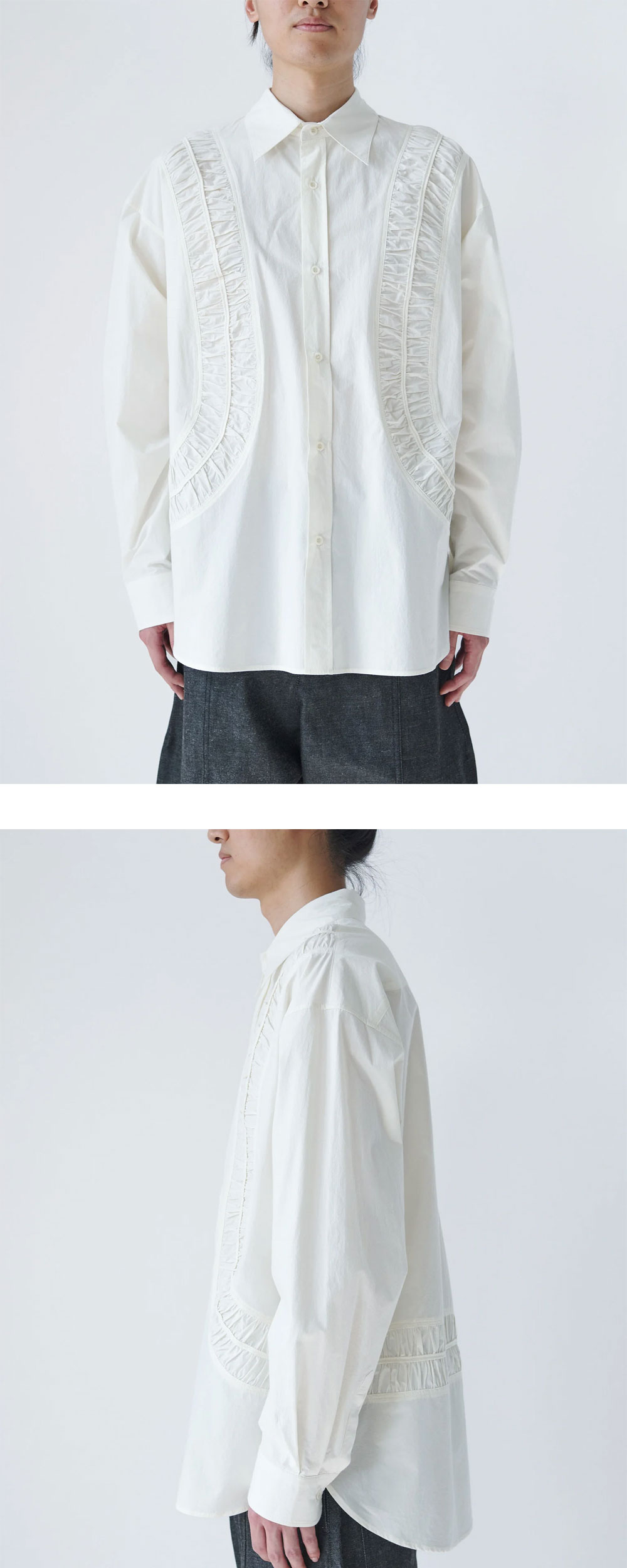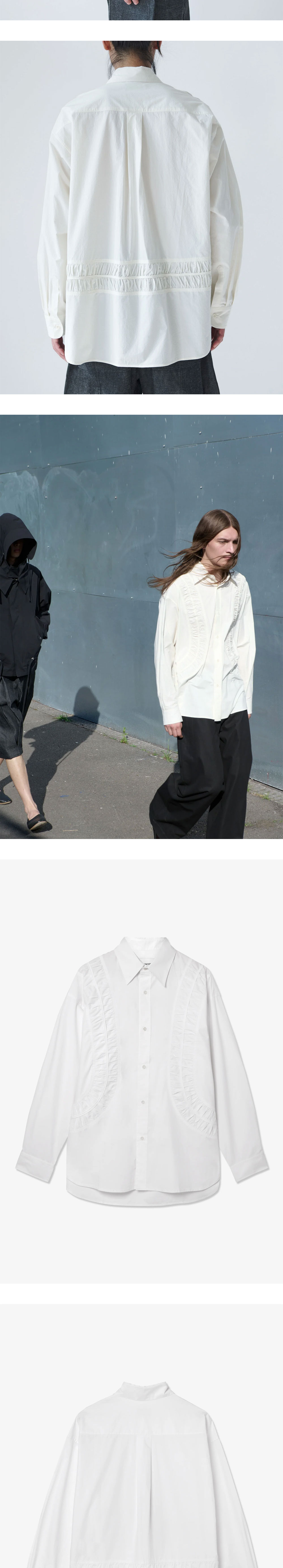 세이지 네이션 포실 LS 셔츠 옵틱 화이트입니다. - 코튼 팝린 소재의 오버사이즈 셔츠 - 곡선형 루슈 패널 디테일 - 톤온톤 코로조 버튼 사용 - 100% 코튼 팝린의 쾌적한 착용감 *모델스펙: 185cm M Size 착용