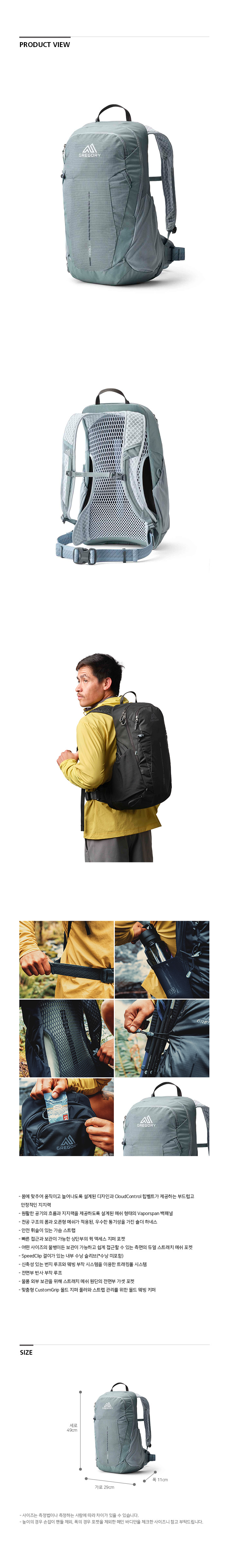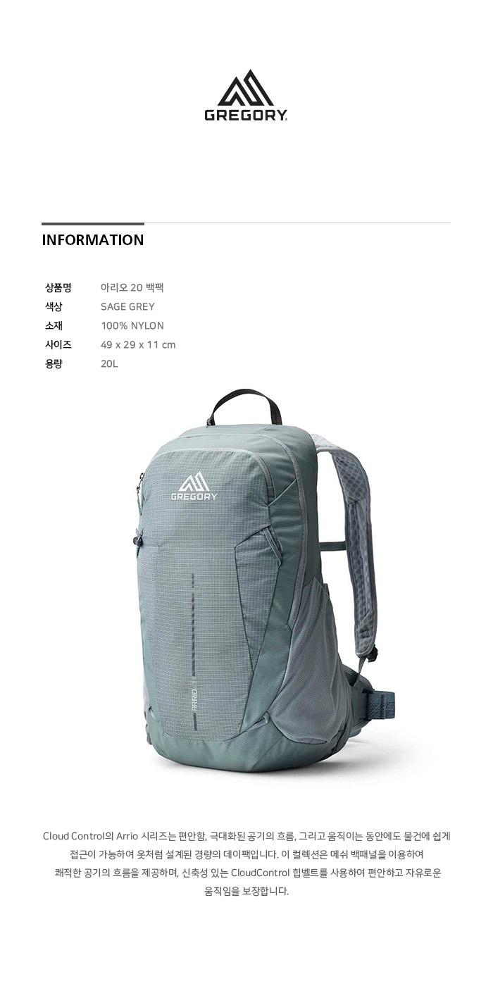 그레고리 아리오20 백팩 세이지 그레이 가벼운등산배낭 당일산행가방