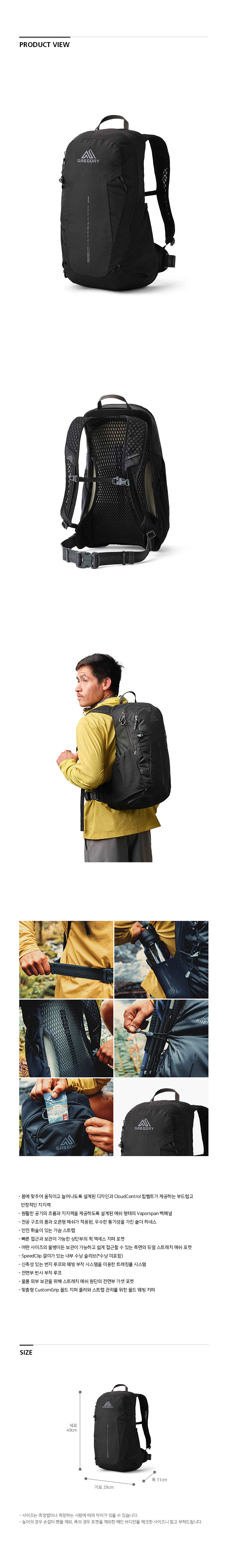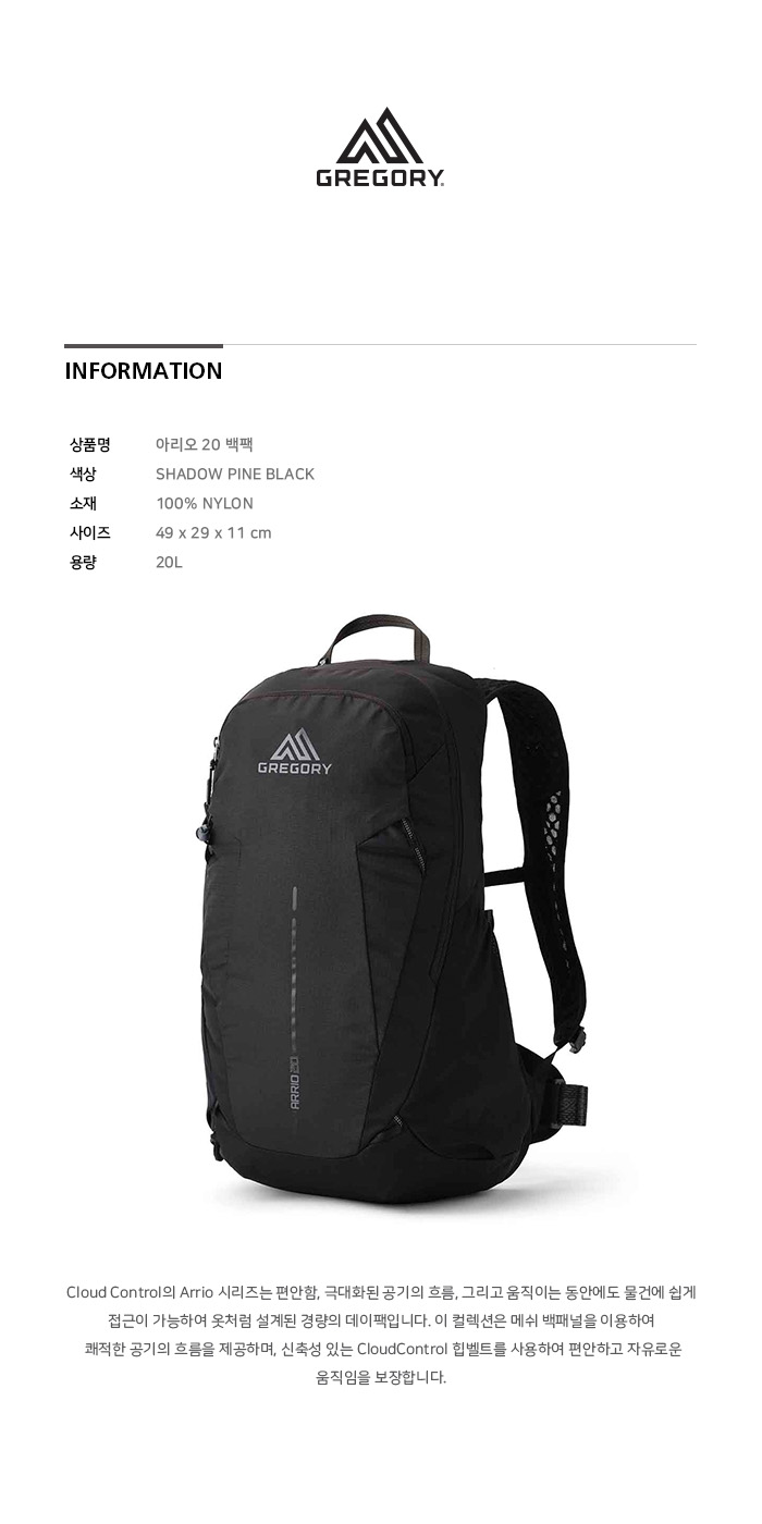 그레고리 아리오20 백팩 섀도우 파인 블랙 가벼운등산배낭 당일산행가방