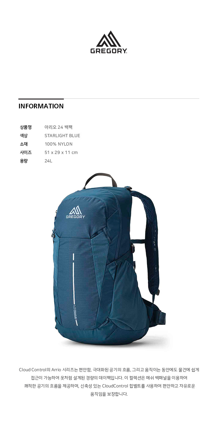 그레고리 아리오24 백팩 스타라이트 블루 가벼운등산배낭 당일산행가방