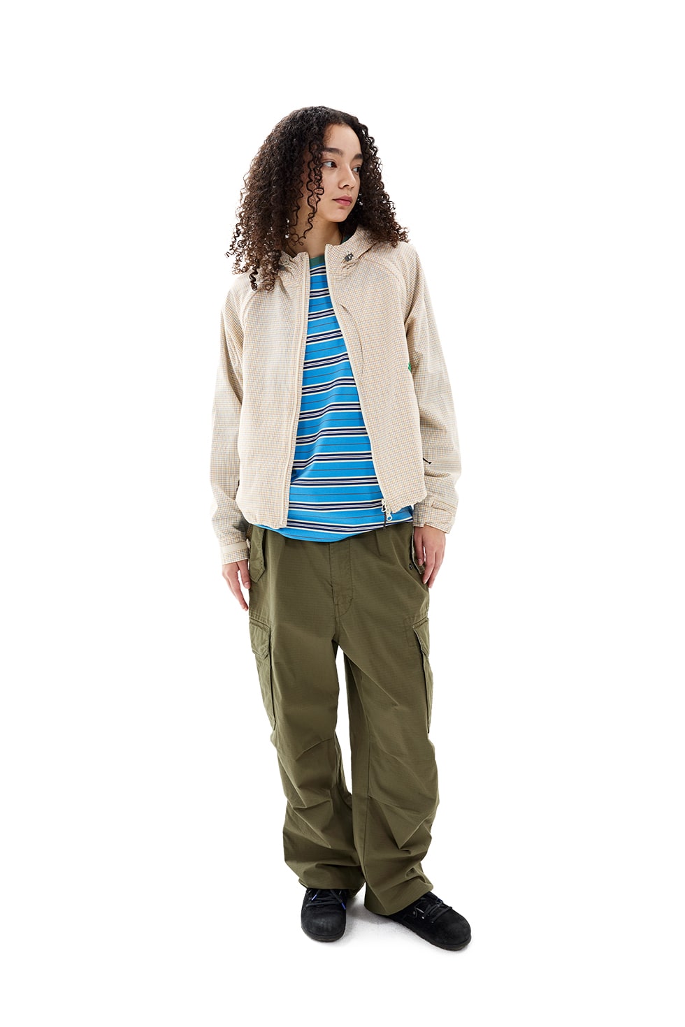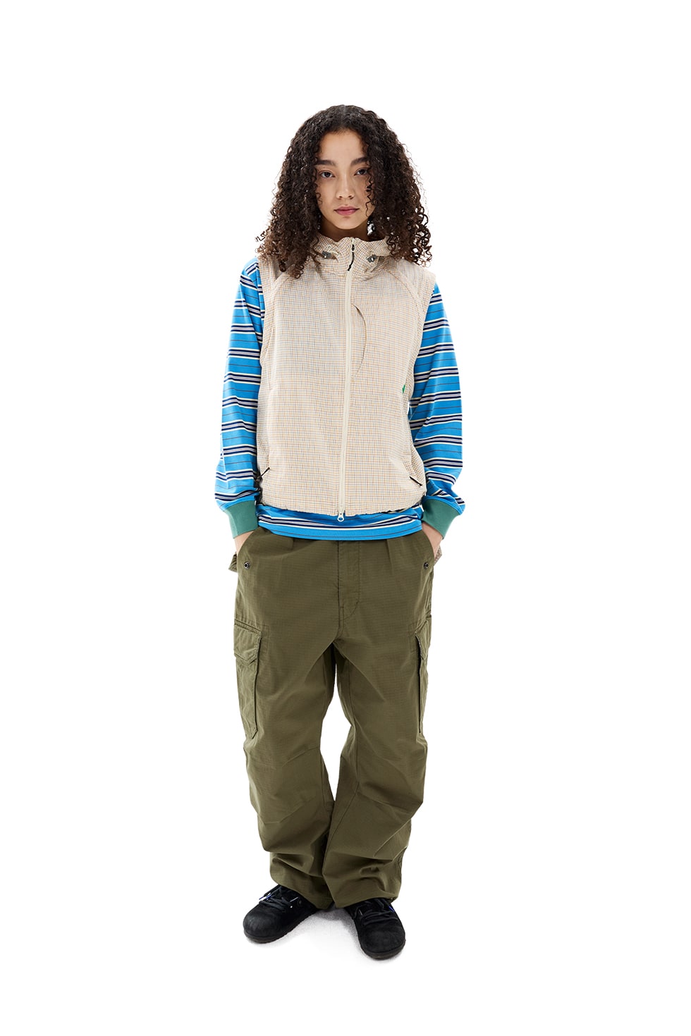 · 투웨이 자켓 · 코튼 체크 원단 사용 · 가먼트 바이오 워싱을 통해 형태 안정성과 부드러운 터치감 구현 · 탈부착 가능한 소매 · 가슴 이중 포켓 디테일 · 후드, 밑단 스트링 조절 가능 · 소맷단 벨크로로 조절 가능 · 전면, 포켓에 YKK 지퍼 사용 · 데이브레이크 심볼 고무라벨 Cotton 100% Made in Vietnam Male - Large/181cm,Female - Small/171cm