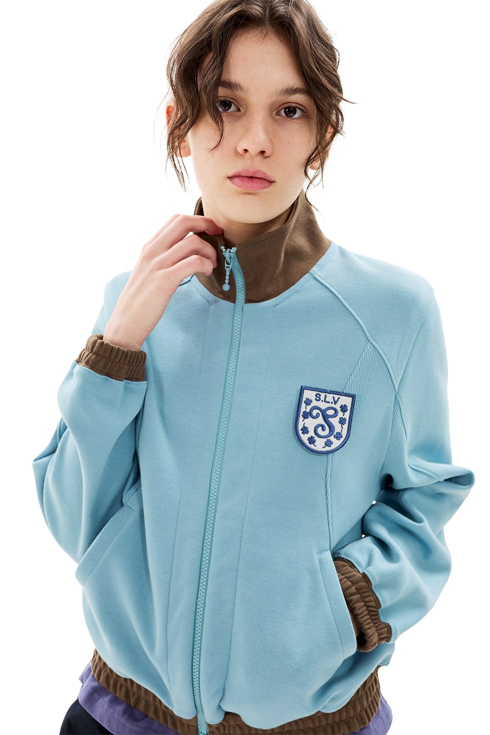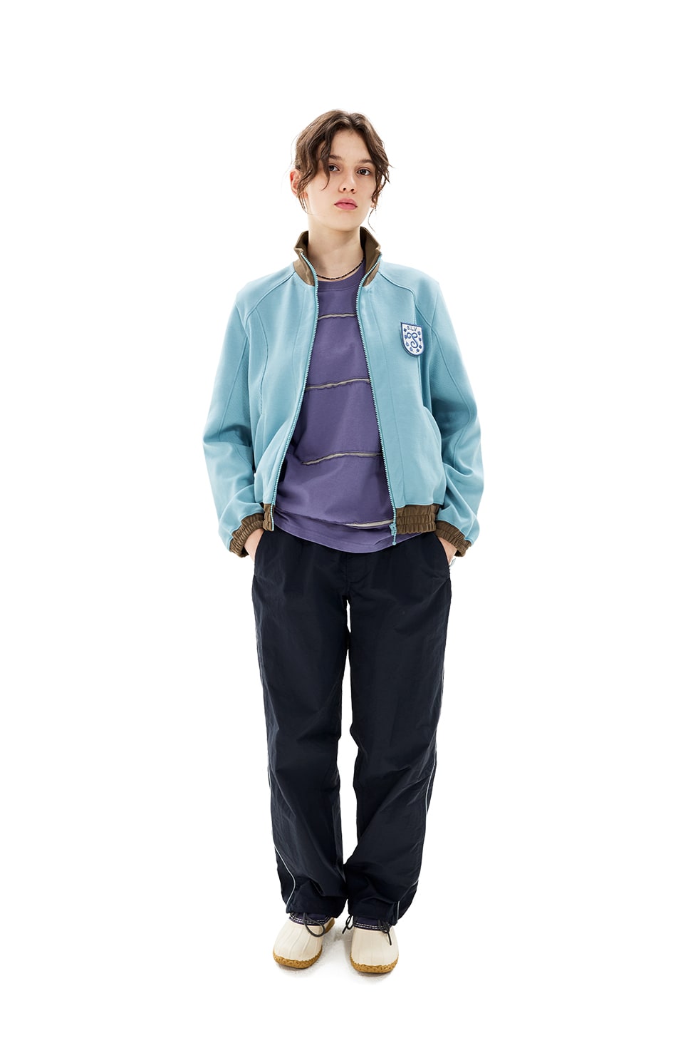 · 트랙 자켓 · 면,폴리에스터 혼방 특양면 원단 사용 · 폴리에스터 원사와 면 원사를 적절히 혼방하여 가볍고 스포티한 느낌 · 유연하고 소프트한 터치감 · 활동성을 고려하여 설계된 절개 라인 · 몸판 밑단, 소맷단 배색으로 밴딩 처리 · 전면, 포켓에 YKK 지퍼 사용 · 탈부착 가능한 두가지 타입의 와펜 Cotton 100% Made in China Female - Small/169.5cm