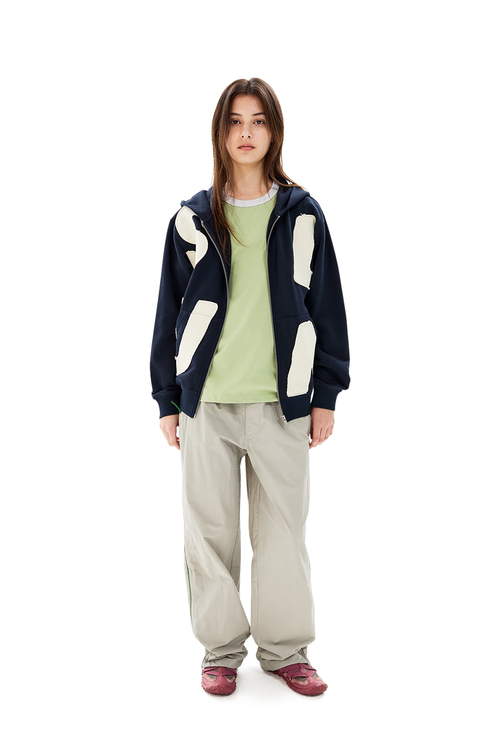 · 캐피탈 후드 집업 · 면, 폴리에스터 혼방 원단 사용 · 기모 없음 · 폴리에스터 원사와 면 원사를 적절히 혼방하여 가볍고 스포티한 느낌 · 유연하고 소프트한 터치감 · 밑단, 소맷단 밴딩 처리 · 캥거루 포켓 · 전면에 YKK 지퍼 사용 · 캐피탈 그래픽 Raw edge 아플리케 Cotton 54% Polyester 46% Made in China Male - Large/187.5cm,Female - Small/168cm