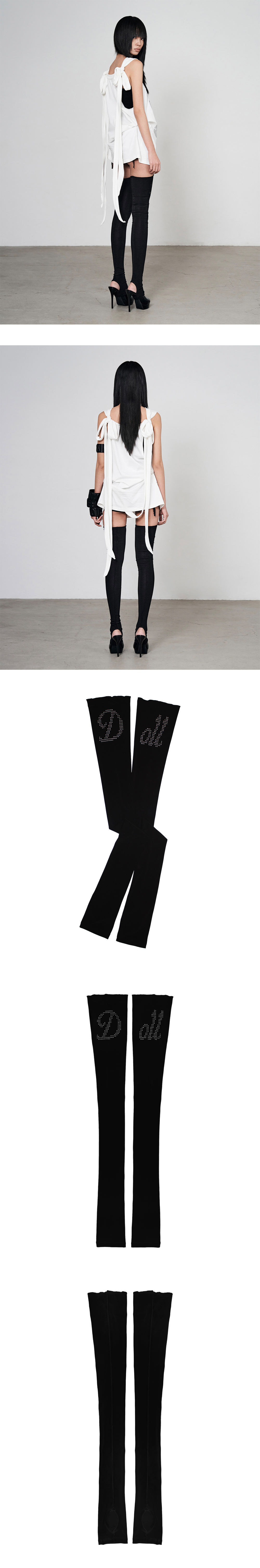Model is 170cm wears size 1 허벅지 기장 스타킹 실루엣 앞 레터링 레이저 컷팅 디테일 안정적인 착용을 위한 발 고리 디테일 로우컷 마감 디테일 가볍고 부드러운 스트레치 원단으로 편안한 착용감 Size(Length/Top Width/Bottom Width) 1 : 81cm/14.5cm/10cm Polyester 95% Polyurethane 5%
