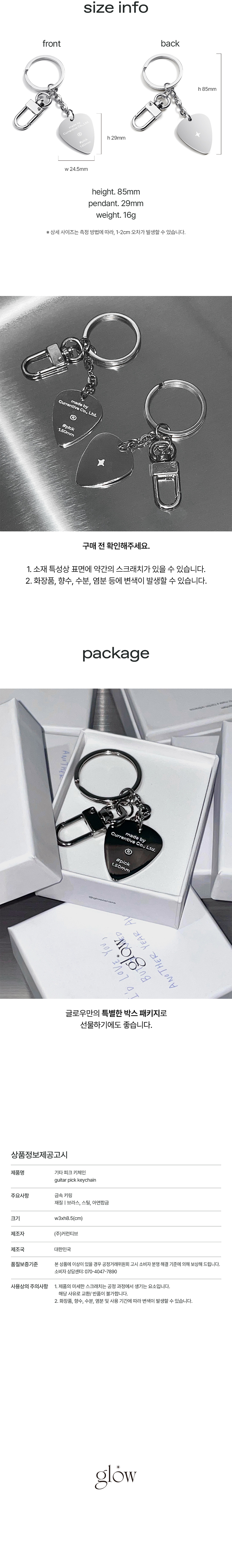 - 기타 피크 쉐입의 메탈 키링 - 활용도 높은 두 가지 타입의 고리 - 선물하기 좋은 글로우만의 특별한 패키지