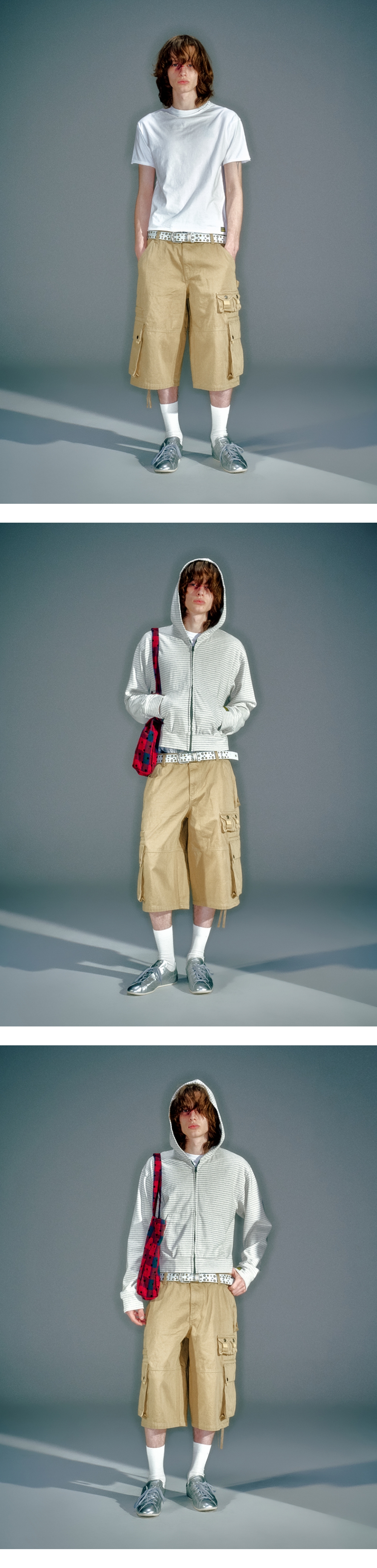 넉넉한 수납공간의 카고 버뮤다 팬츠 가먼츠 워싱 입체포켓에 달린 웨빙 끈으로 다양한 연출 가능 앞면 주머니 퍼티그 스티치 디테일 베이컨트 제작 리벳 사용 M/L(CM) Length : 68.5 / 69.5 Waist : 42 / 44.5 Hip : 55 / 57.5 Thigh : 36 / 37 Front Rise : 31.5 / 32.5 Hem : 31.5 / 32.5 Model is 180cm and is wearing a size M COTTON 100%
