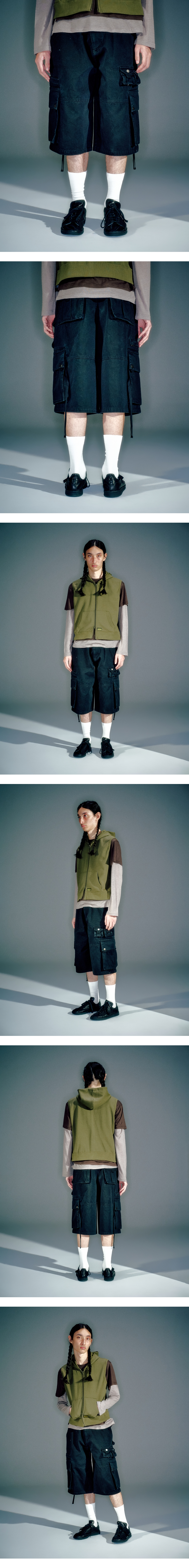 넉넉한 수납공간의 카고 버뮤다 팬츠 가먼츠 워싱 입체포켓에 달린 웨빙 끈으로 다양한 연출 가능 앞면 주머니 퍼티그 스티치 디테일 베이컨트 제작 리벳 사용 M/L(CM) Length : 68.5 / 69.5 Waist : 42 / 44.5 Hip : 55 / 57.5 Thigh : 36 / 37 Front Rise : 31.5 / 32.5 Hem : 31.5 / 32.5 Model is 180cm and is wearing a size M COTTON 100%