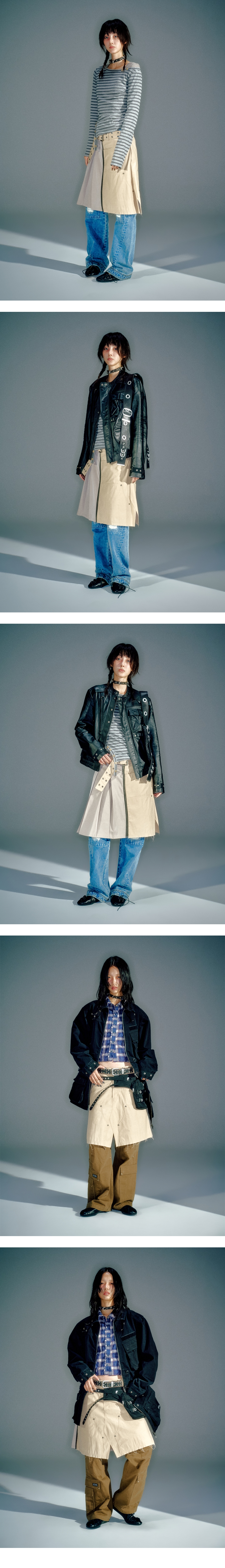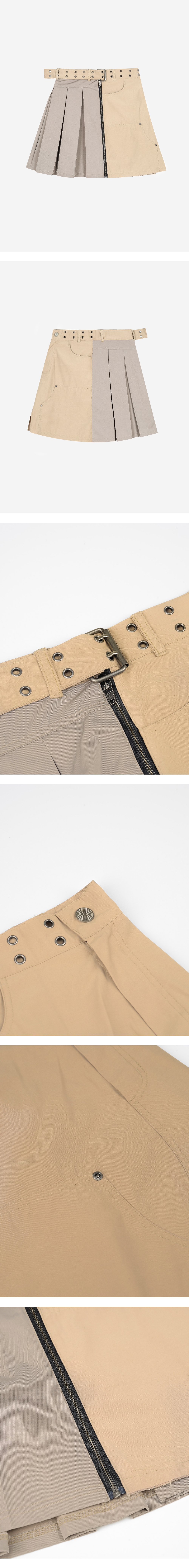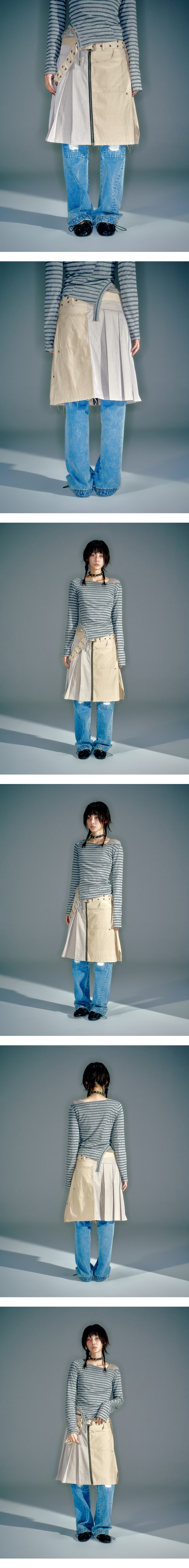 플리츠 스커트와 카펜터 스타일의 랩 스커트를 결합한 하이브리드 디자인 허리 벨트 디테일로 사이즈 조절과 포인트를 동시에 연출 서로 다른 텍스처 배치로 구조적이고 감각적인 실루엣 완성 YKK 투웨이 지퍼 사용으로 레이어드 아이템으로 활용하기 좋음 FREE (CM) Length : 54 Waist : 40.5 Hip : 56 Hem : 69 1. Model is 174cm and is wearing a size S 2. Model is 168cm and is wearing a size S POLYESTER 65%. COTTON 35%