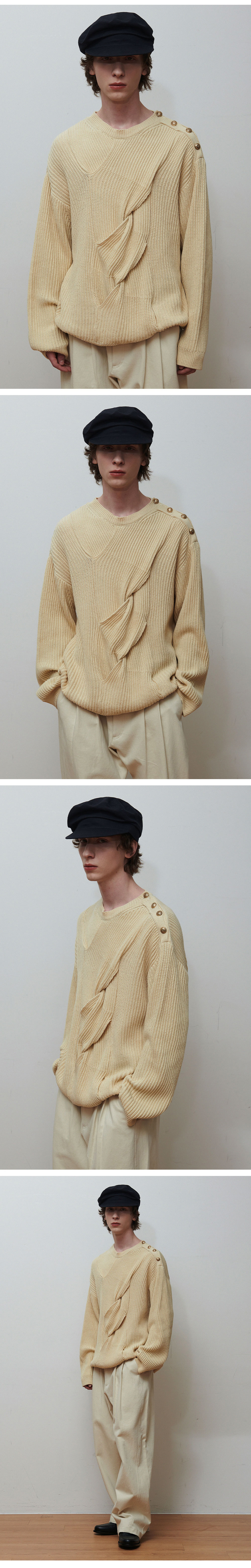 ㆍ면과 아크릴 혼방 원사로 제작되어 부드러움과 내구성을 동시에 갖춘 니트 ㆍ전면에 큼직한 케이블 디테일을 더해 클래식하면서도 확실한 포인트 완성 ㆍ어깨 라인에 코팅된 금장 단추 여밈을 적용해 고급스럽고 세련된 무드 연출 ㆍ자연스럽게 흐르는 루즈한 원사 조직감이 매력적인 실루엣 구현 ㆍ단독 착용은 물론 셔츠·티셔츠와의 레이어드 스타일링에도 활용도 높은 아이템 ㆍ유니섹스 제품으로 제작되었으며, 여성 고객님께는 M 사이즈 추천