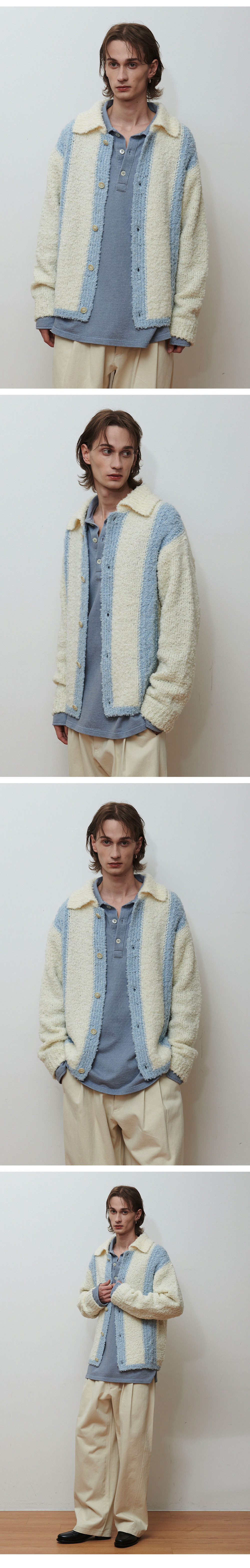 ㆍ입체감이 살아있는 부클 조직으로 완성된 유니크한 니트 가디건 ㆍ감각적인 배색 디테일이 돋보이며 스타일링에 확실한 포인트를 더하는 디자인 ㆍ카라 디테일을 더해 단정하면서도 세련된 무드 연출 ㆍ전면 세로 배색 라인으로 슬림해 보이는 시각적 효과와 구조적인 완성도 강조 ㆍ울이 블렌딩된 원사로 포근한 터치감과 안정적인 착용감 구현 ㆍ유니섹스 제품으로 제작되었으며, 여성 고객님께는 M 사이즈 추천