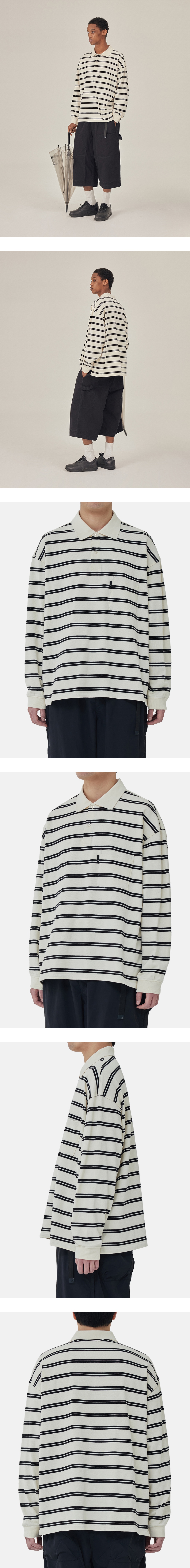 와이드 한 실루엣의 긴팔 폴로 셔츠 · 와이드 한 오버사이즈 실루엣. · 접이식 카라와 2버튼 여밈의 클래식한 폴로 셔츠. · 스트라이프 피케 원단 사용. · 수축 방지 가공된 원단으로 세탁 후에도 변형이 적음. · 간단한 소지품을 수납할 수 있는 가슴 주머니. · 옆트임의 시그니처 테이프 디테일. · 주머니 부분 모이프 심볼 포인트 라벨 부착. · 편안한 착용감을 위해 손목 립 부분의 시접을 갈라서 처리. 모니터 사양에 따라 상품의 색상이 실제 상품과 다소 차이가 날 수 있습니다.