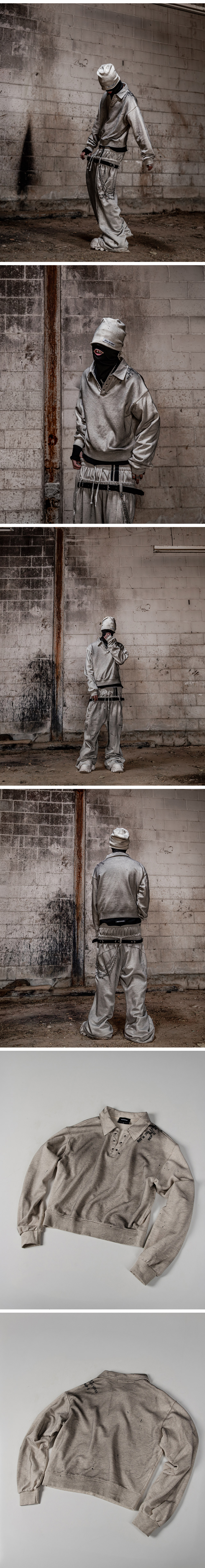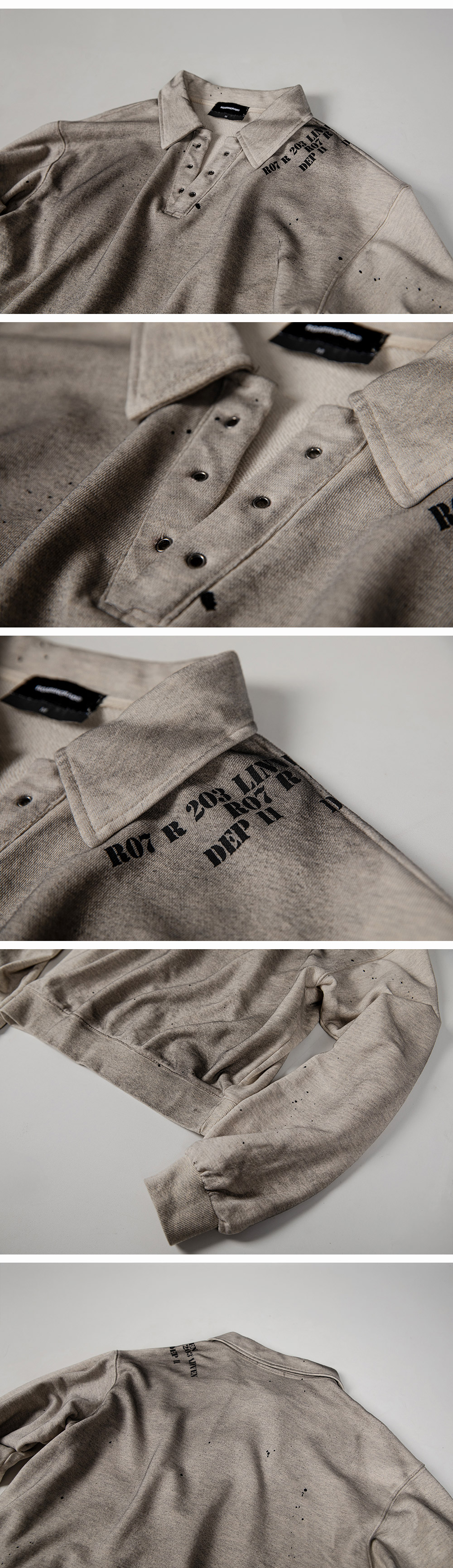 Fabric : 100% Cotton - 크롭 핏 - 카라 및 아일렛 디테일 - 숄더 프린트 디테일 - 핸드메이드 스프레이 & 페인팅 가공 • 제조국 : 대한민국 • 세탁 방법 : 뒤집어 찬물 세탁, 건조기 사용 금지 • 핸드메이드 제품으로 워싱 및 효과는 제품마다 상이 할 수 있음 Size Guide (단위 CM) M : 어깨 57, 가슴 59, 총장 62, 소매 68 L : 어깨 59, 가슴 62, 총장 64, 소매 69