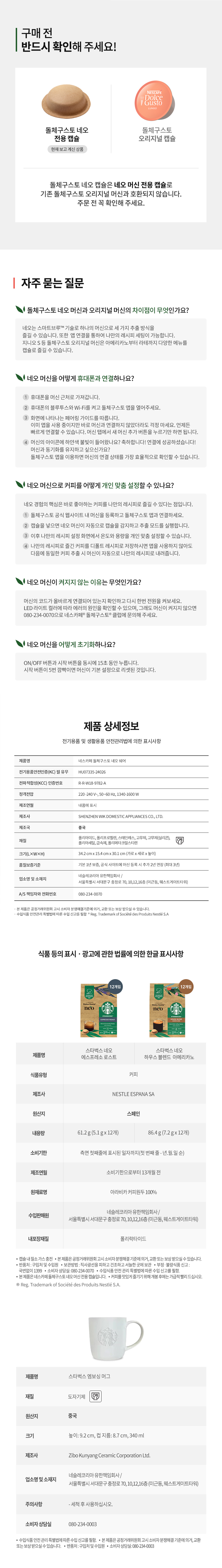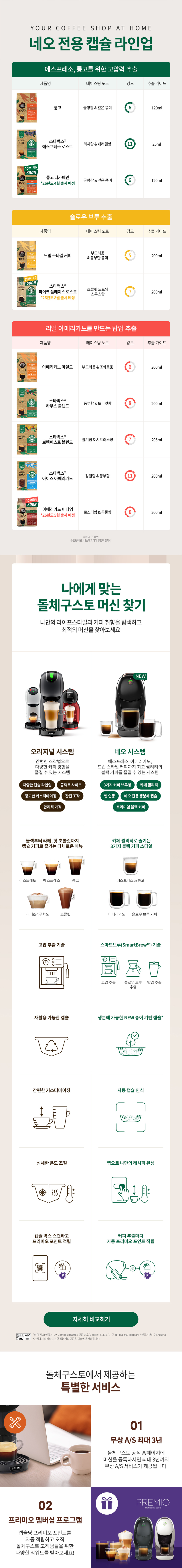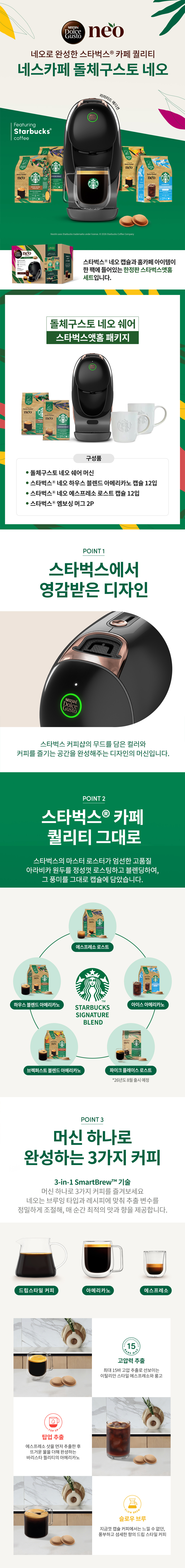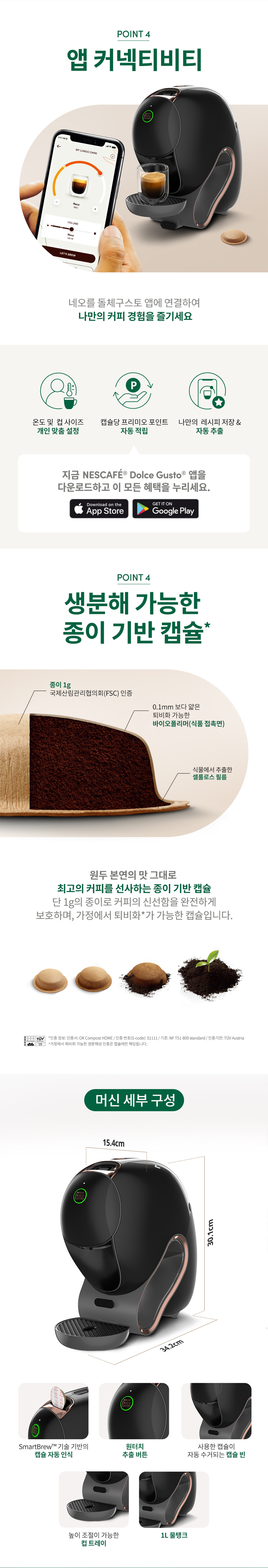 ※ 패키지 구성 Neo 머신+ 캡슐 2 + 머그2 - 돌체구스토 네오 머신 - 스타벅스 네오 하우스 블렌드 아메리카노 캡슐 12P [탑업 추출/ 강도8] - 스타벅스 네오 에스프레소 로스트 캡슐 12P [고압력 추출 / 강도11] - 스타벅스 글라스 머그 2P ① 1개의 머신에서 3가지 타입의 완벽한 3 in 1 스마트 브루 - 에스프레소를 위한 15바 고압 추출 - 리얼 아메리카노로 즐기는 탑업 추출 - 드립 스타일 커피 슬로우 브루 추출 ② 캡슐 자동 인식 기술로 완성하는 프리미엄 커피 캡슐을 넣기만 하면 레시피에 맞게 추출 ③ 종이 기반 캡슐로 100% 퇴비화 가능 ④ 캡슐빈으로, 번거로움을 덜하게 , 드립 트레이로 높이 조정 가능하게! ⑤ 모던한 메탈 소재 캡슐 투입구 ⑥ 앱 연동으로 커스터 마이징 추출 가능(온도 및 용량 조절) ⑦ 기존보다 물용량 UP ! 1L 워터탱크로 디스케일링 알람 및 세척 및 관리 용이