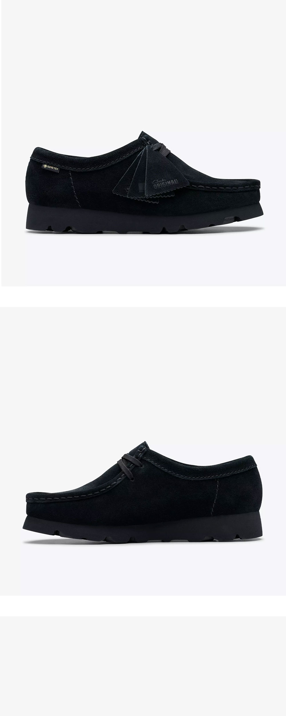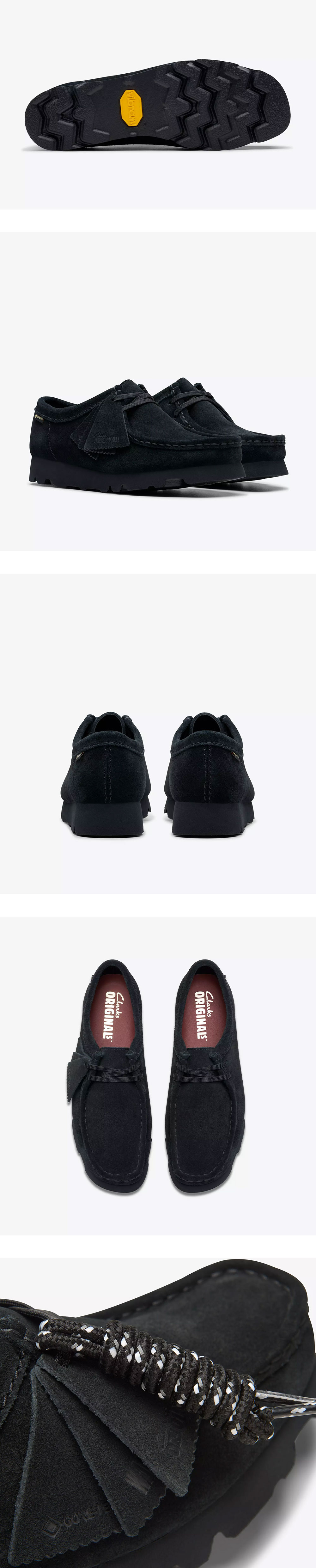 클락스 우먼 왈라비 고어텍스 블랙 스웨이드 입니다. - 고어텍스(GORE-TEX) 소재의 방수 및 투습 기능 - 블랙 컬러의 프리미엄 스웨이드 가죽 어퍼 - 내구성과 접지력이 우수한 비브람(Vibram) 아웃솔 - 톤온톤 로고 탭과 왁스 코팅 슈레이스 디테일
