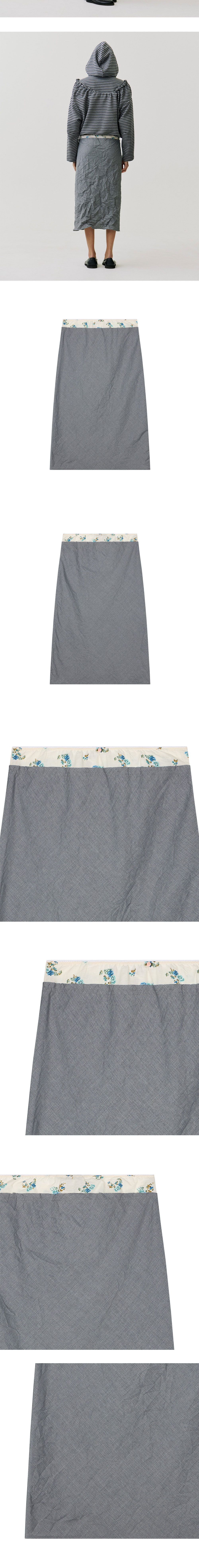 레이브 리뷰 우먼 이네즈 스커트 그레이 오프화이트 플라워 입니다. - 불규칙한 주름 가공 텍스처 포인트 - 블루 플라워 패턴이 들어간 오프화이트 허리 밴딩 배색 - 바디 라인을 따라 자연스럽게 떨어지는 H라인 실루엣 - 그레이 컬러와 화사한 플라워 디테일의 조화