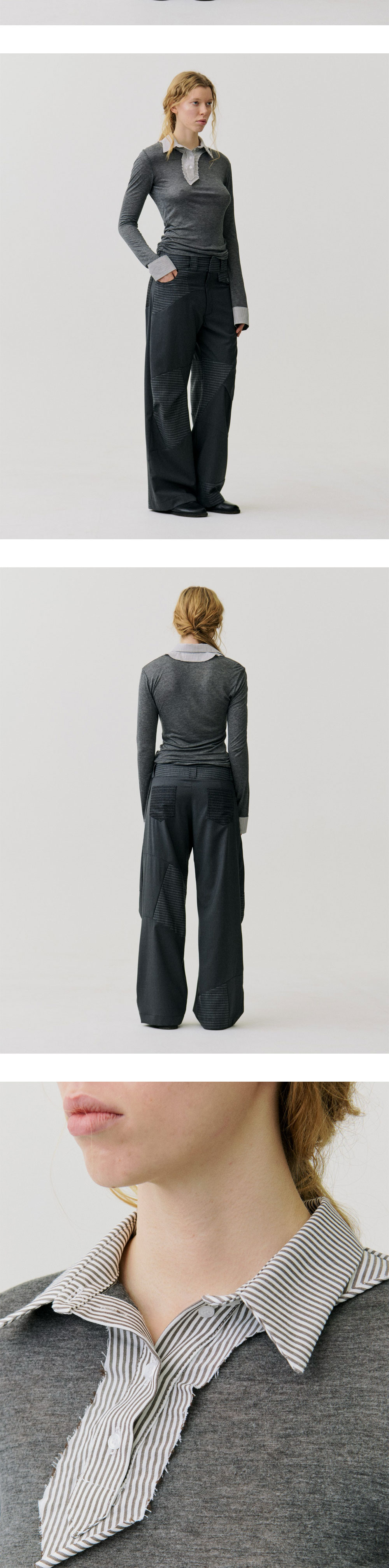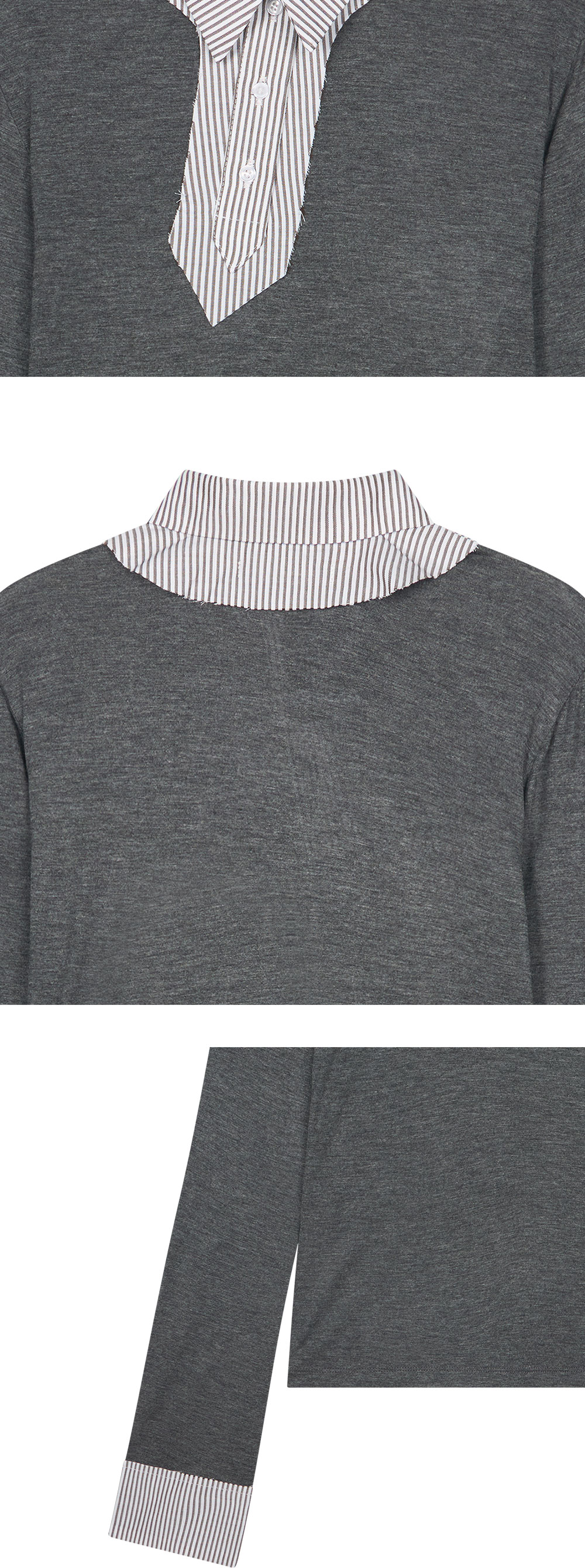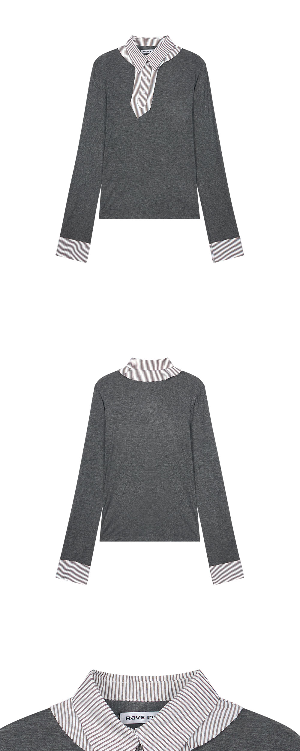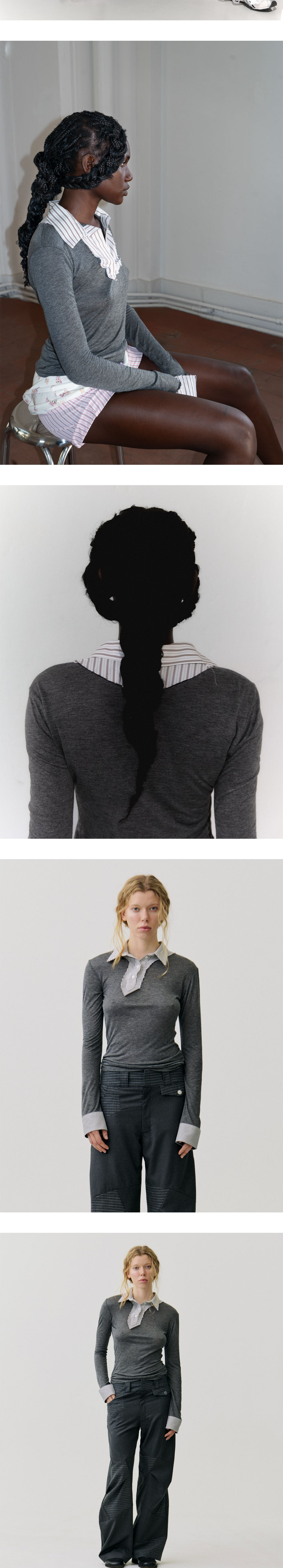 레이브 리뷰 우먼 비브 탑 그레이 블루 스트라이프 입니다. - 셔츠 칼라와 버튼 다운 디테일이 결합된 슬림핏 롱 슬리브 - 소매 끝단 셔츠 커프스 마감으로 레이어드 무드 연출 - 포멀함과 캐주얼함이 공존하는 유니크한 배색 디자인
