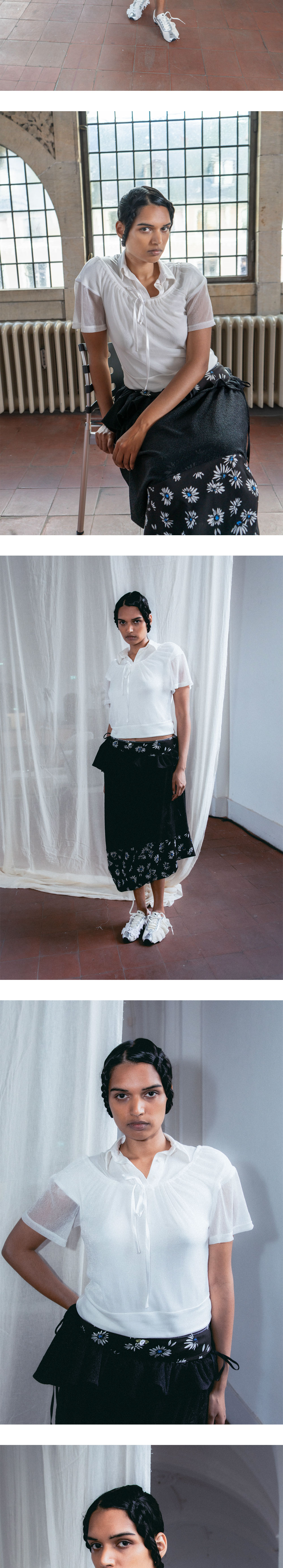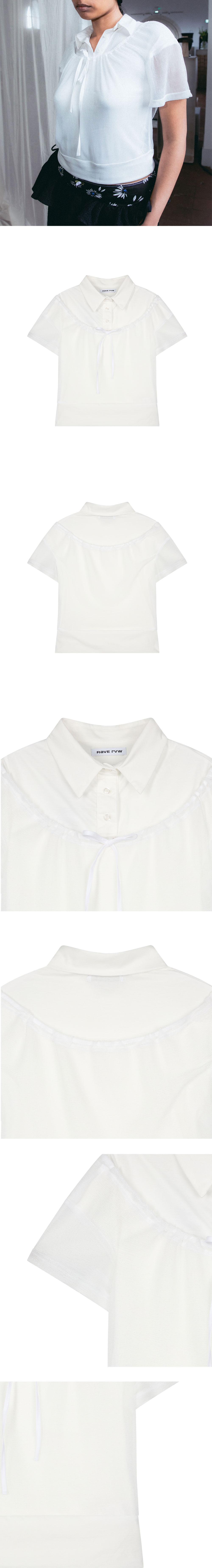 레이브 리뷰 우먼 레나 탑 화이트 글리터 입니다. - 전면 흉선 라인을 따라 흐르는 화이트 리본 타이 디테일 - 리본 라인을 중심으로 상단과 하단에 더해진 은은한 셔링 주름 - 세 개의 화이트 버튼이 적용된 폴로 셔츠 스타일의 칼라 디자인 - 화이트 컬러 베이스에 미세하게 반짝이는 글리터 질감