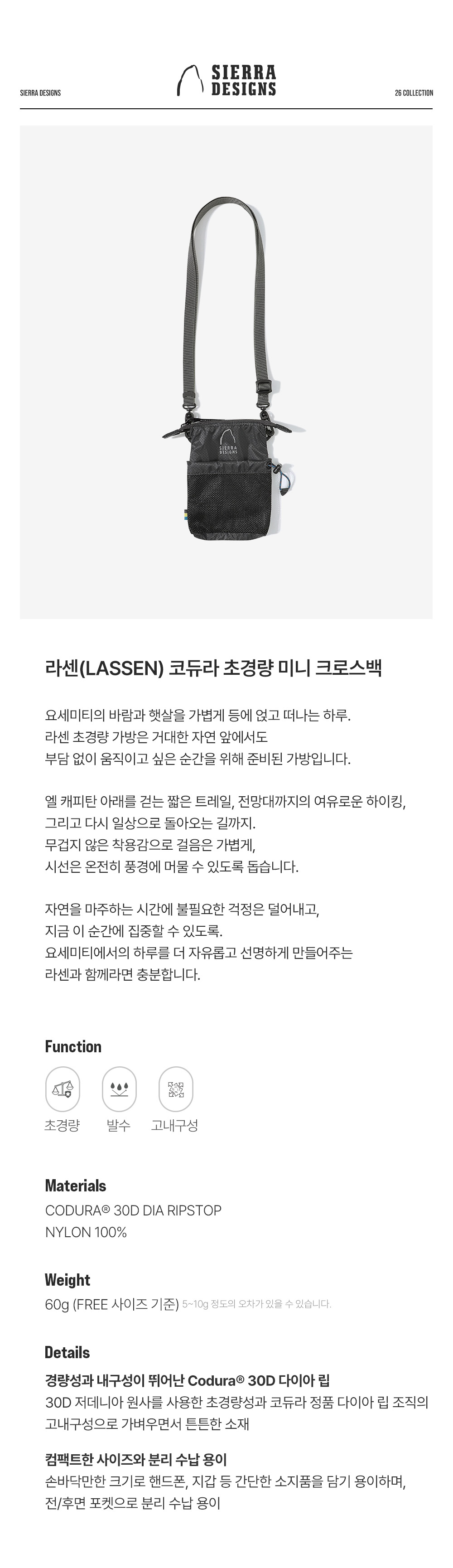 시에라디자인 라센 코듀라 초경량 미니 크로스백 차콜