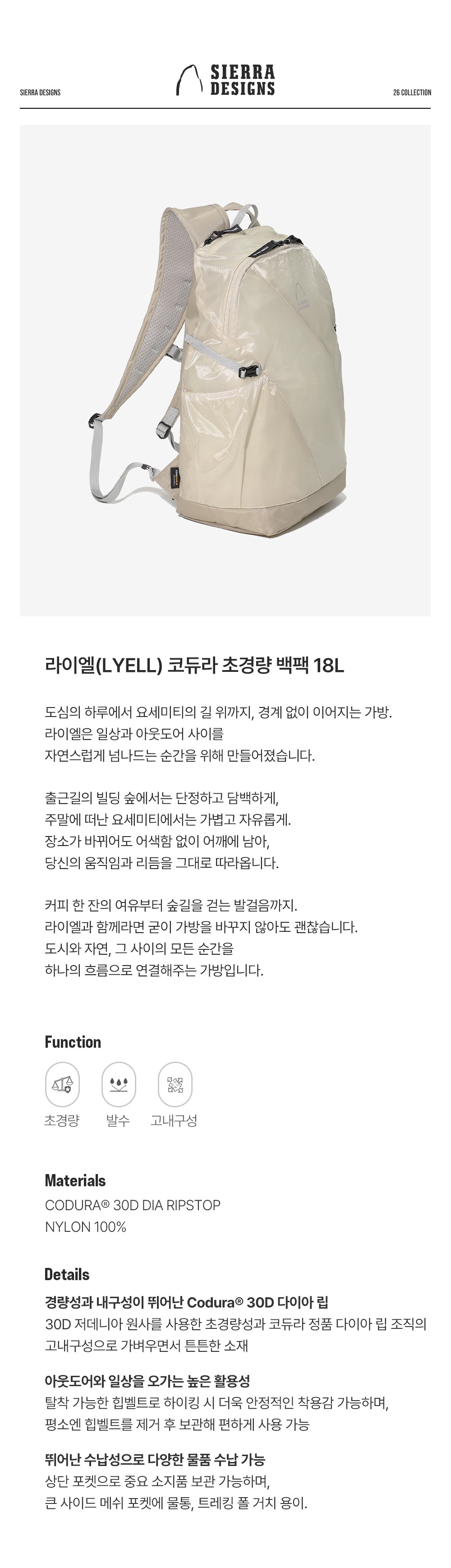 시에라디자인 라이엘 코듀라 초경량 백팩 18L 아이보리