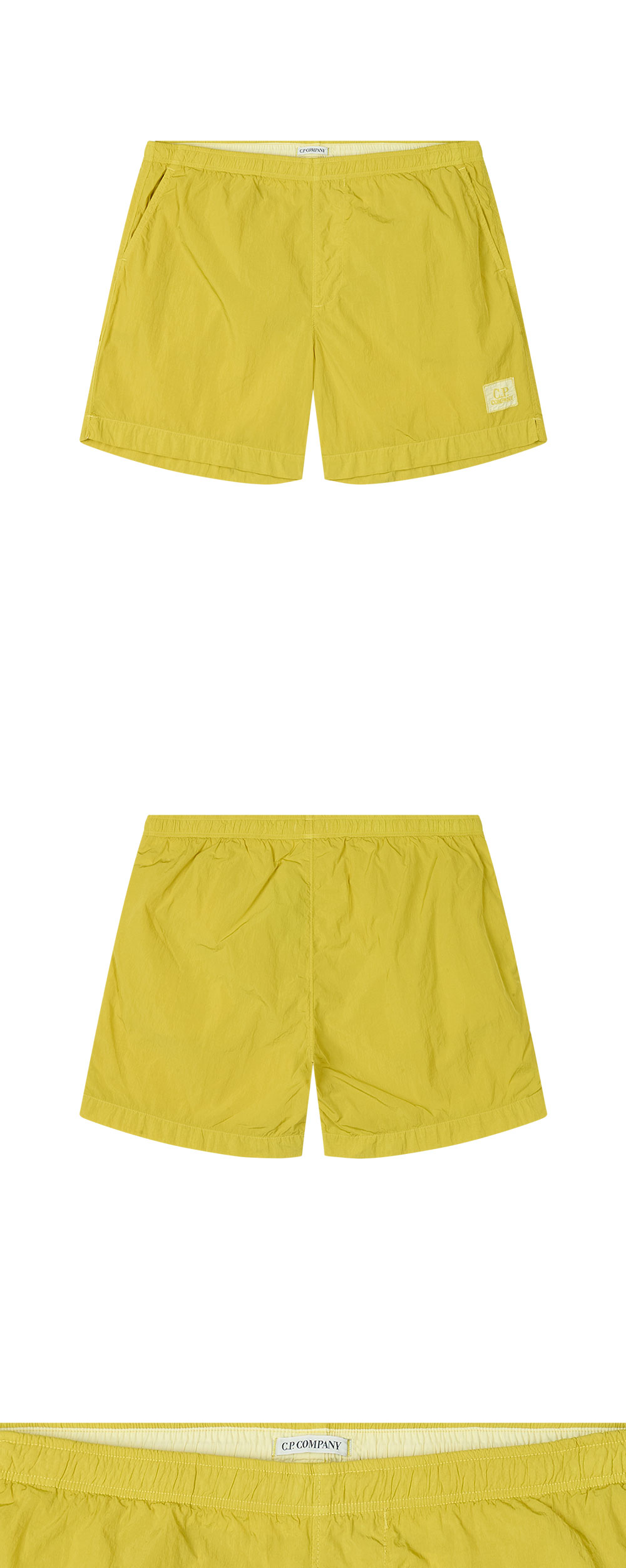 C.P. 컴퍼니 에코 크롬 R 스윔 쇼츠 앤티크 모스 입니다. - 왼쪽 하단 C.P. 컴퍼니 옐로우 패치 로고 디테일 - 신축성 있는 엘라스틱 웨이스트 밴드 디자인 - 전면 양사이드 슬릿 포켓 구성 - 가먼트 다잉 처리를 통한 독특한 색감과 질감 - 내부 메쉬 브리프 안감 포함