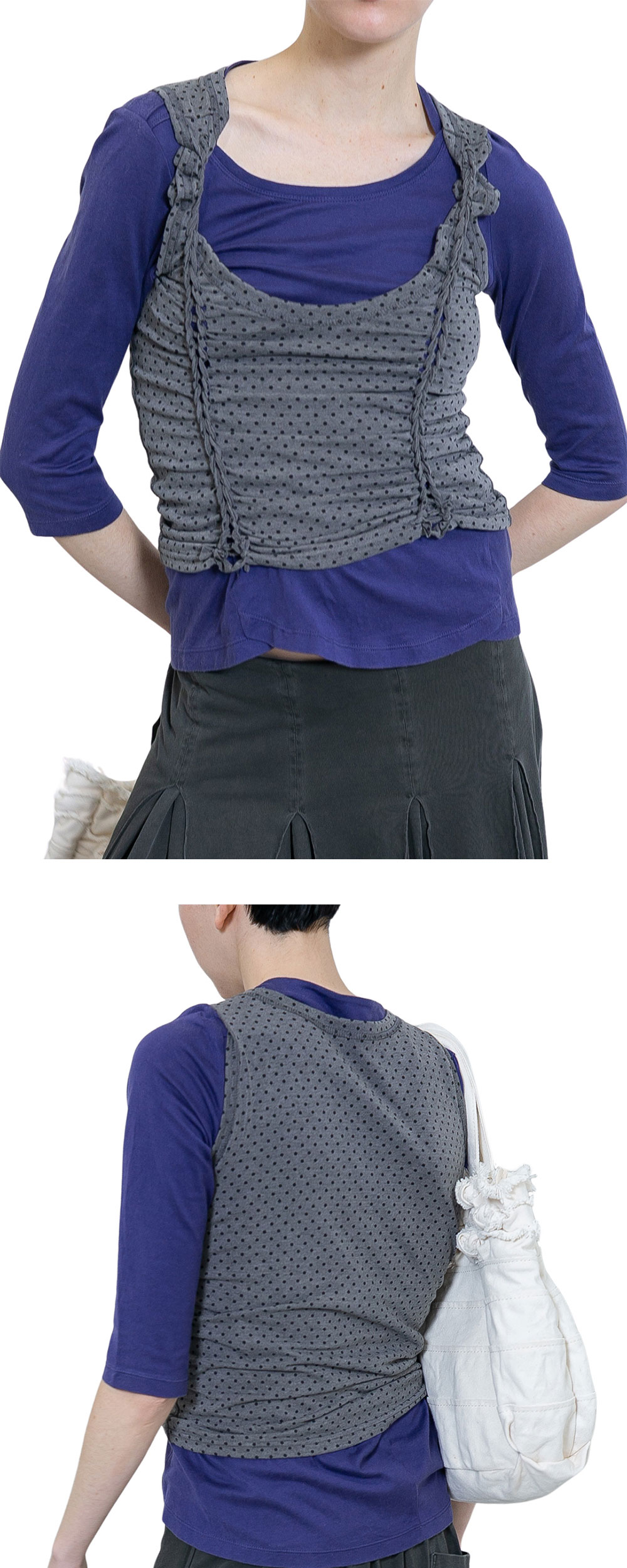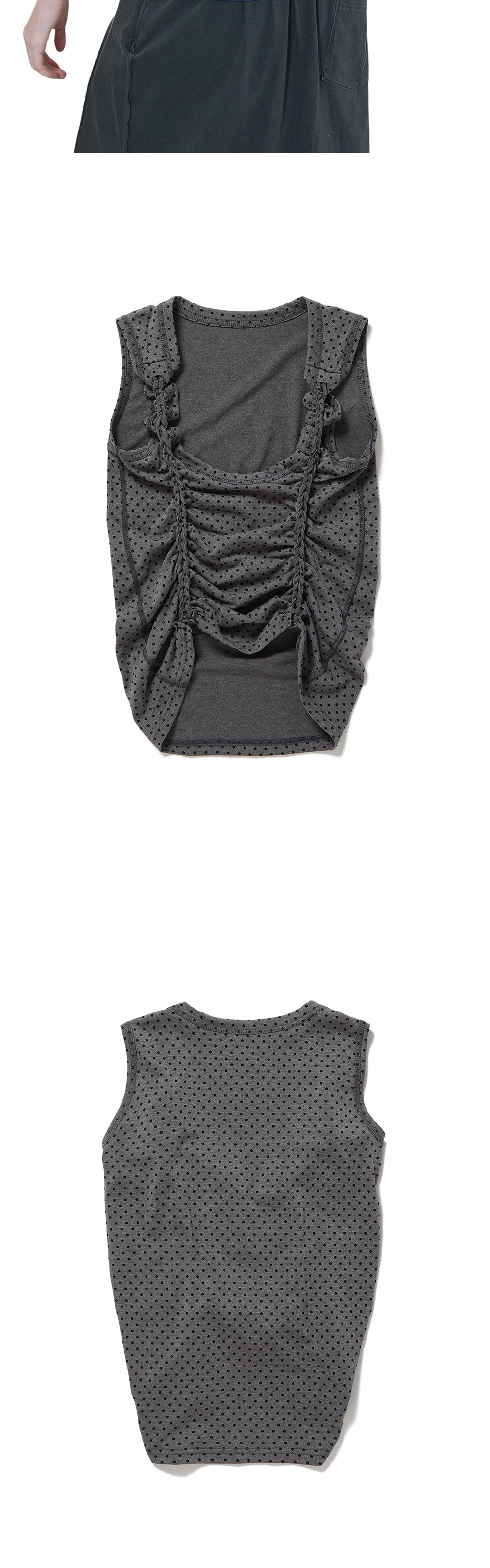 퍼버즈 우먼 브레이드 탱크 탑 그레이 입니다. - 전후면의 입체적인 브레이드(땋은 장식)와 셔링 텍스처 - 신축성 있는 코튼 혼방 소재와 몸에 밀착되는 슬림 핏 - 잔잔한 도트 패턴이 적용된 빈티지한 무드 - 넓은 라운드 넥라인의 슬리브리스 디자인 * 모델 스펙 : 173 cm