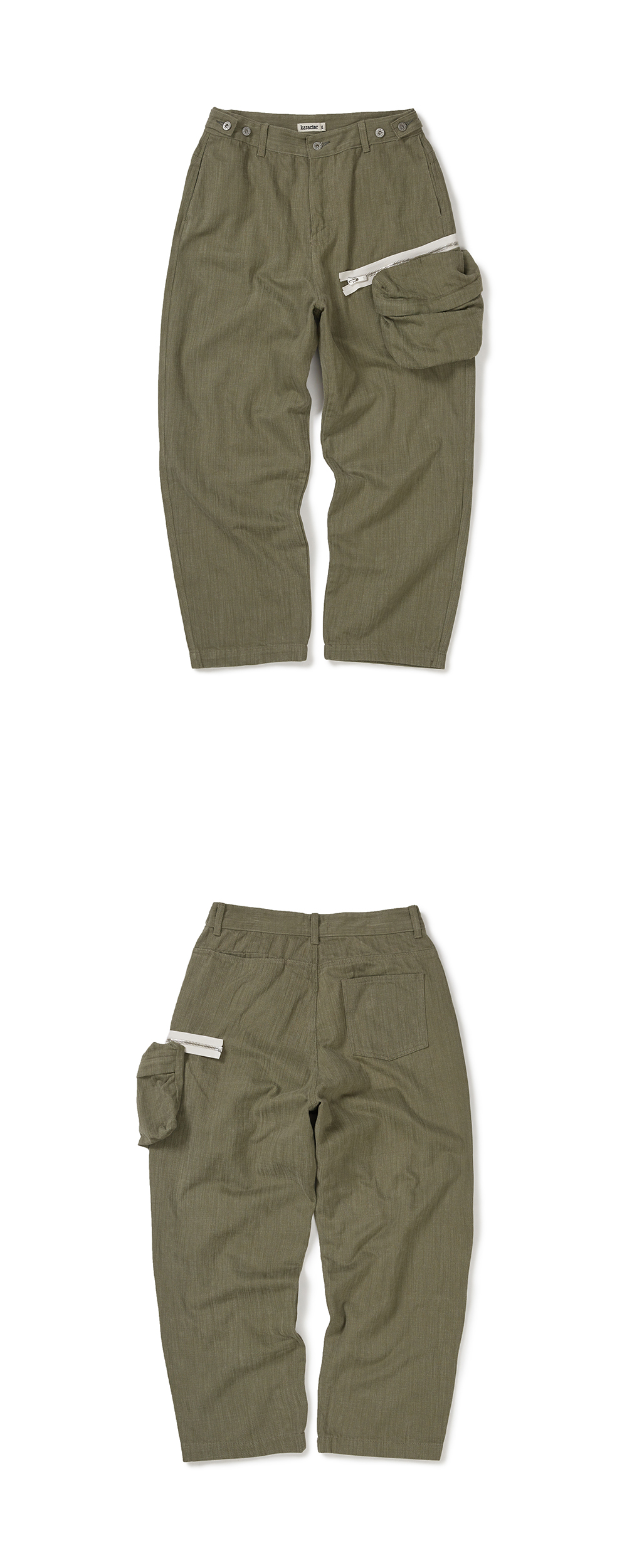 Product Info. - 자연스러운 텍스처의 고밀도 카치온 코튼 원단으로 제작된 트라우저 - 복합 워싱 가공을 통해 내추럴하고 소프트한 터치감 - 릴렉스드 핏 테이퍼드 실루엣으로 편안한 착용감 - 벨트라인 양 사이드 버튼 어드저스터로 허리 사이즈 조절 가능 - 측면 탈착 가능한 파우치 디테일 - 파우치 YKK EXCELLA 지퍼 사양으로 높은 완성도와 안정적인 개폐감