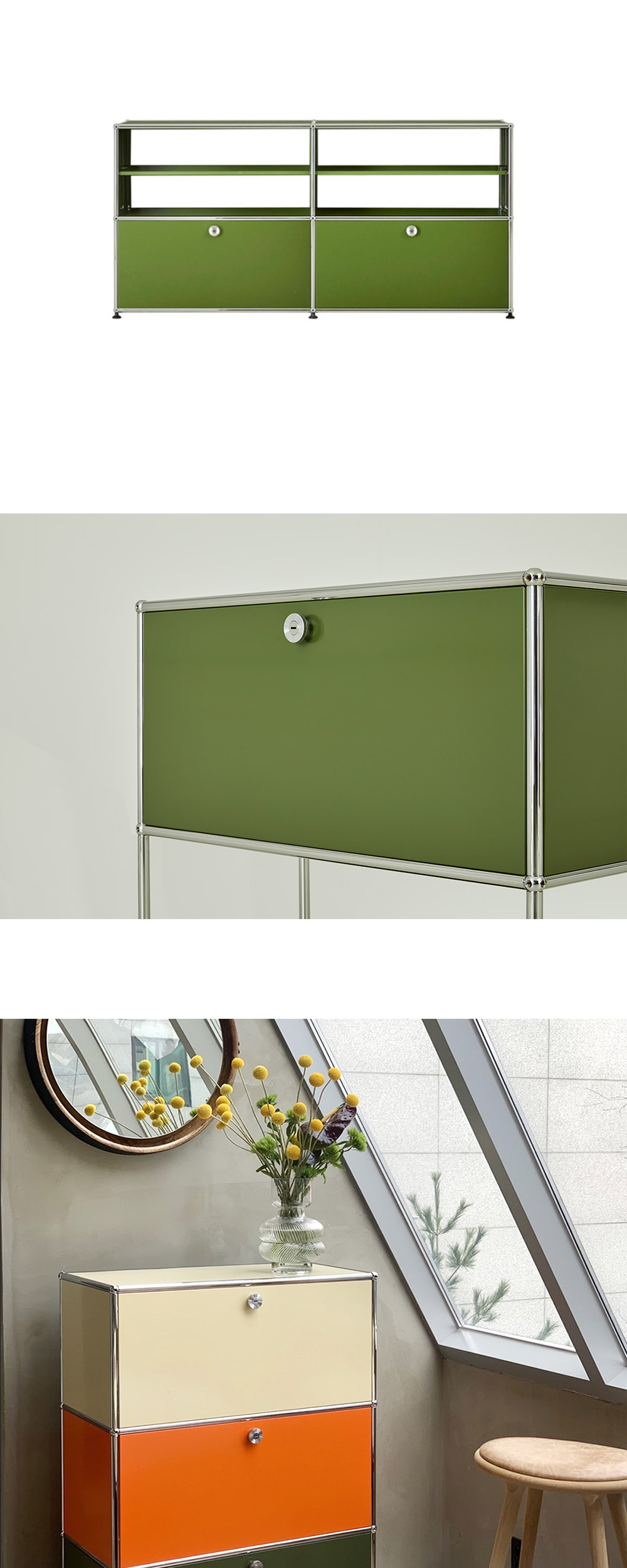 드롭다운 도어와 오픈형 선반으로 구성된 모듈입니다. 오픈형 선반에는 디바이더 선반이 있어 실용적이면서도 편리하게 물건을 수납할 수 있습니다. *열쇠는 별도 옵션으로, 구매를 원하실 경우 문의 부탁드립니다.