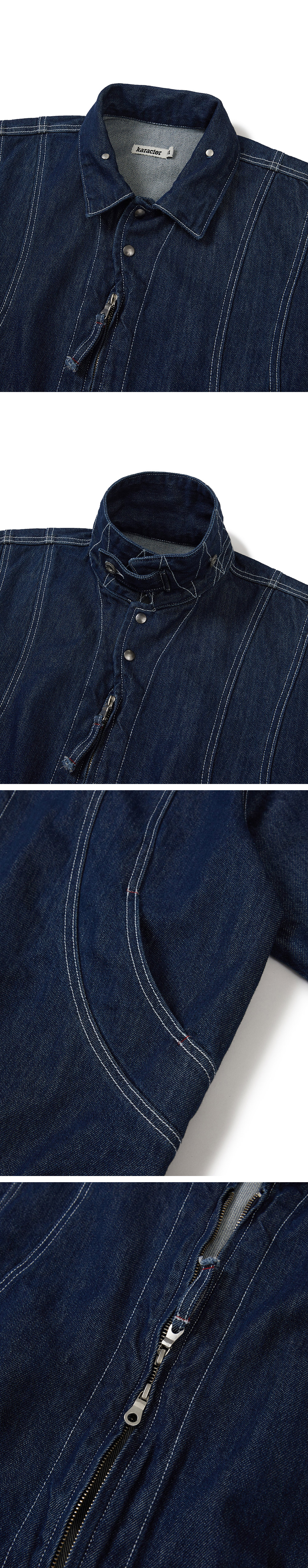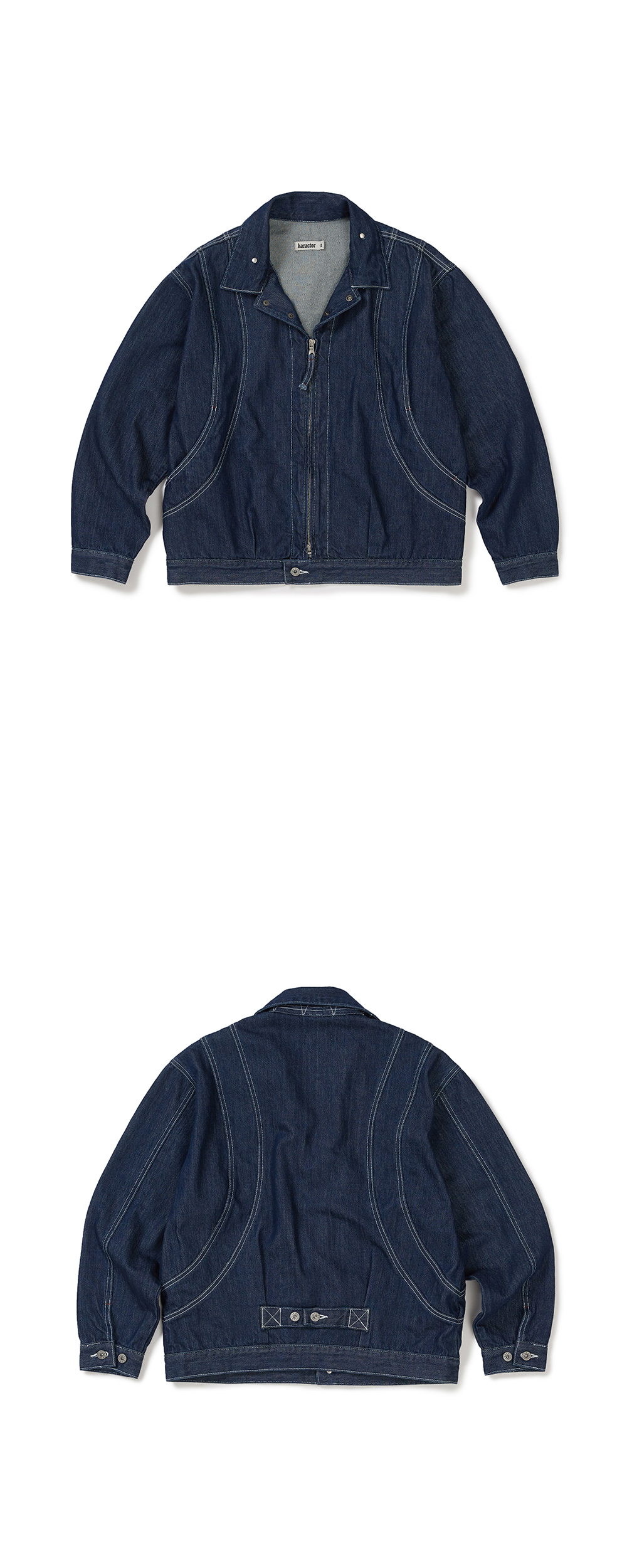 Product Info. - 12oz 터키 ISKO 데님 원단으로 제작된 데님 블루종 - 적당한 중량감의 데님으로 시즌에 구애받지 않는 착용감 - 곡선 패널 디자인으로 입체적인 실루엣 형성 - 전면 패널 라인을 따라 구성된 핸드 포켓 디테일 - 넥라인 YKK 스냅 버튼 적용으로 스탠드 칼라 연출 가능 - 후면 버튼 어드저스터 디테일로 실루엣 조절 가능 - YKK 2-Way 지퍼 사양 - 레드 바텍 포인트