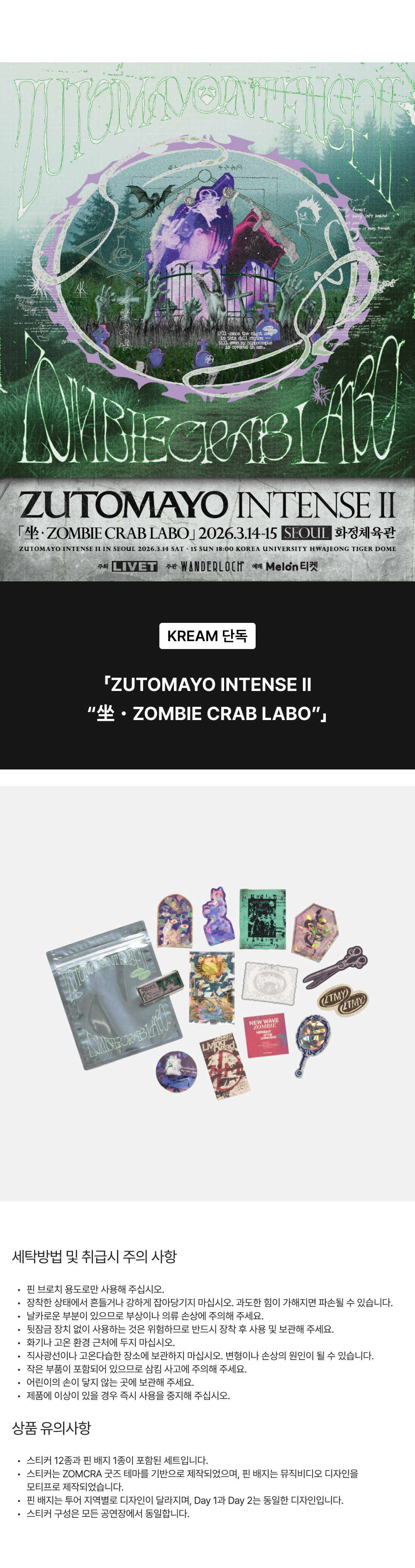 스티커는 ZOMCRA 굿즈 테마를 기반으로 제작되었으며, 핀 배지는 뮤직비디오 디자인을 모티프로 제작되었습니다.